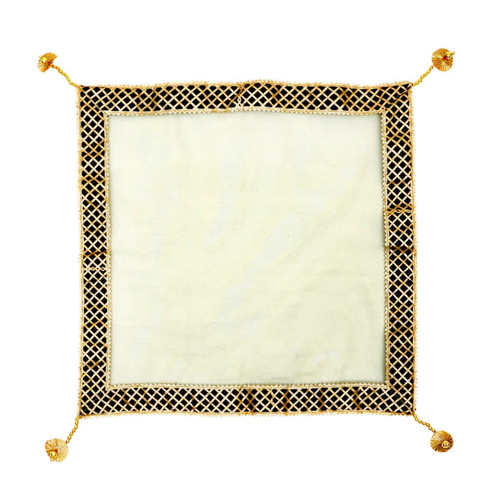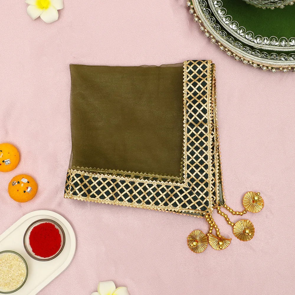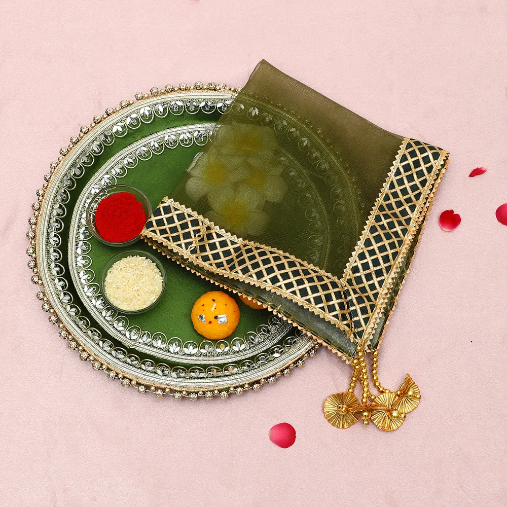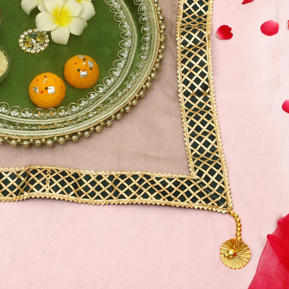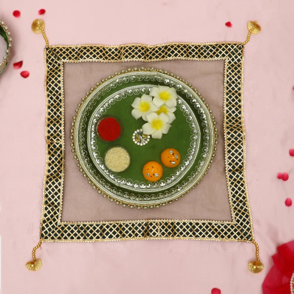 Elevate your pooja rituals with the Royal Green Gota Patti Thali Cover. It perfectly combination of tradition and elegance. Made from heigh quality net fabric, this cover has intricate gota patti lace that adds a rich and elegant traditional touch. The deep forest green color, with golden accents, brings elegant and grace. This cover gives your thali while improving its beauty, this cover is perfect for festive occasions, weddings, and religious ceremonies. It makes every occasions truly special and gives you traditional touch.
