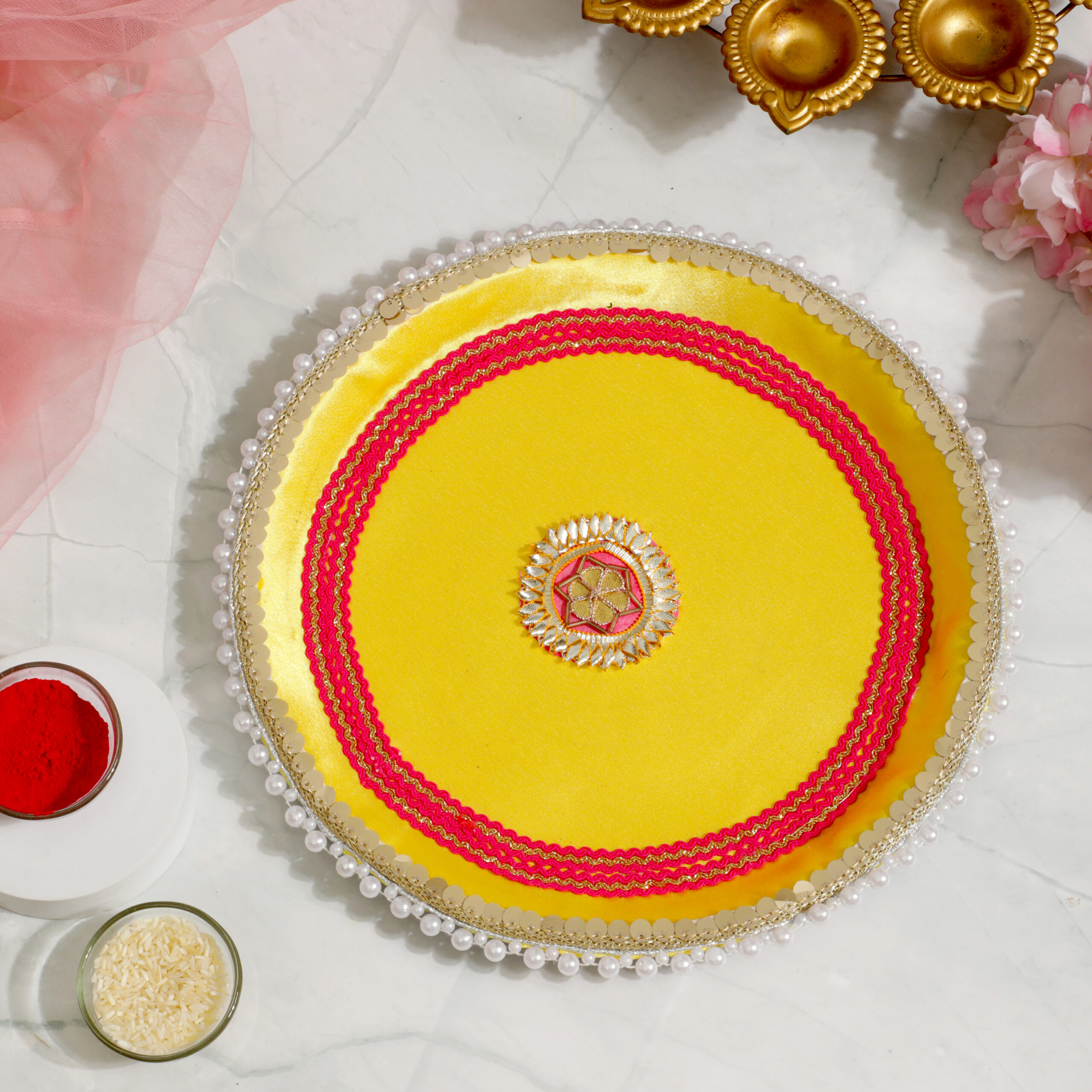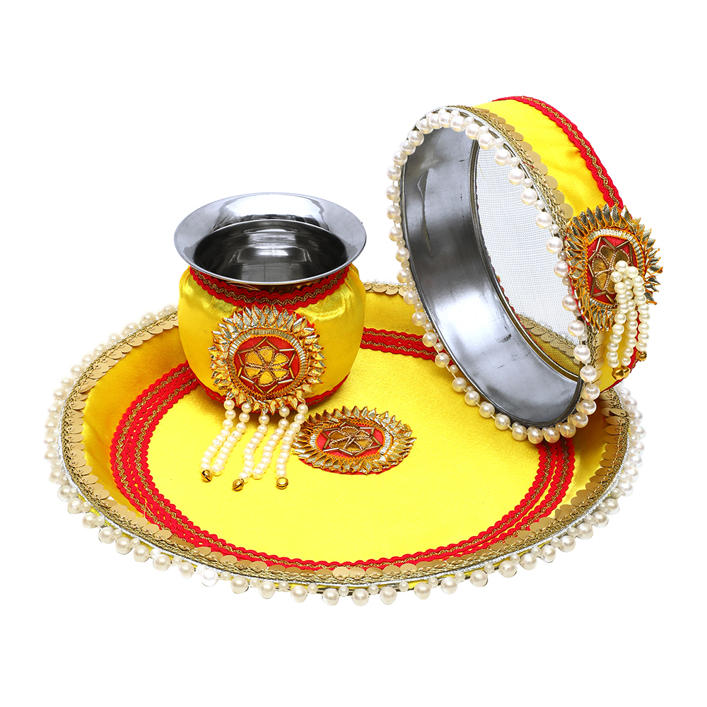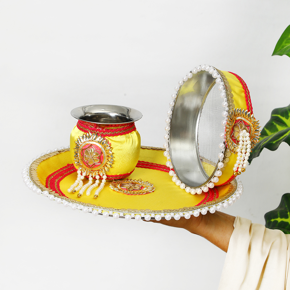 Dazzling Yellow And Pink Karwa Chauth Thali Set