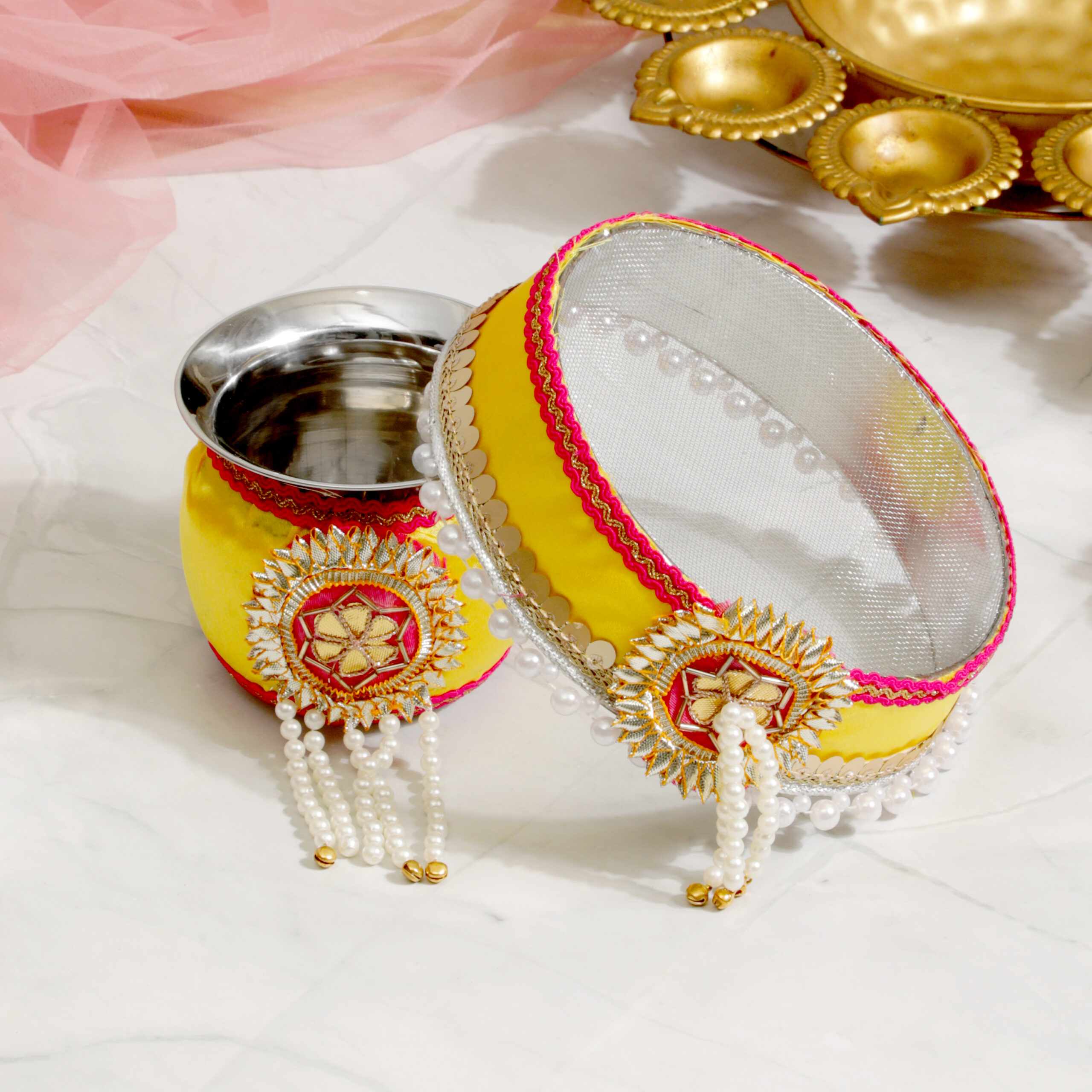 With the Dazzling Yellow and Pink Thali Set, add a burst of color and sophistication to your Karwa Chauth customs. Handmade with vivid yellow and pink tones, this opulent set has fine workmanship and holiday decorations that will make a bright focal point for your parties. It combines style and tradition, complete with all the necessary pooja supplies, so your big day is both lovely and unforgettable.