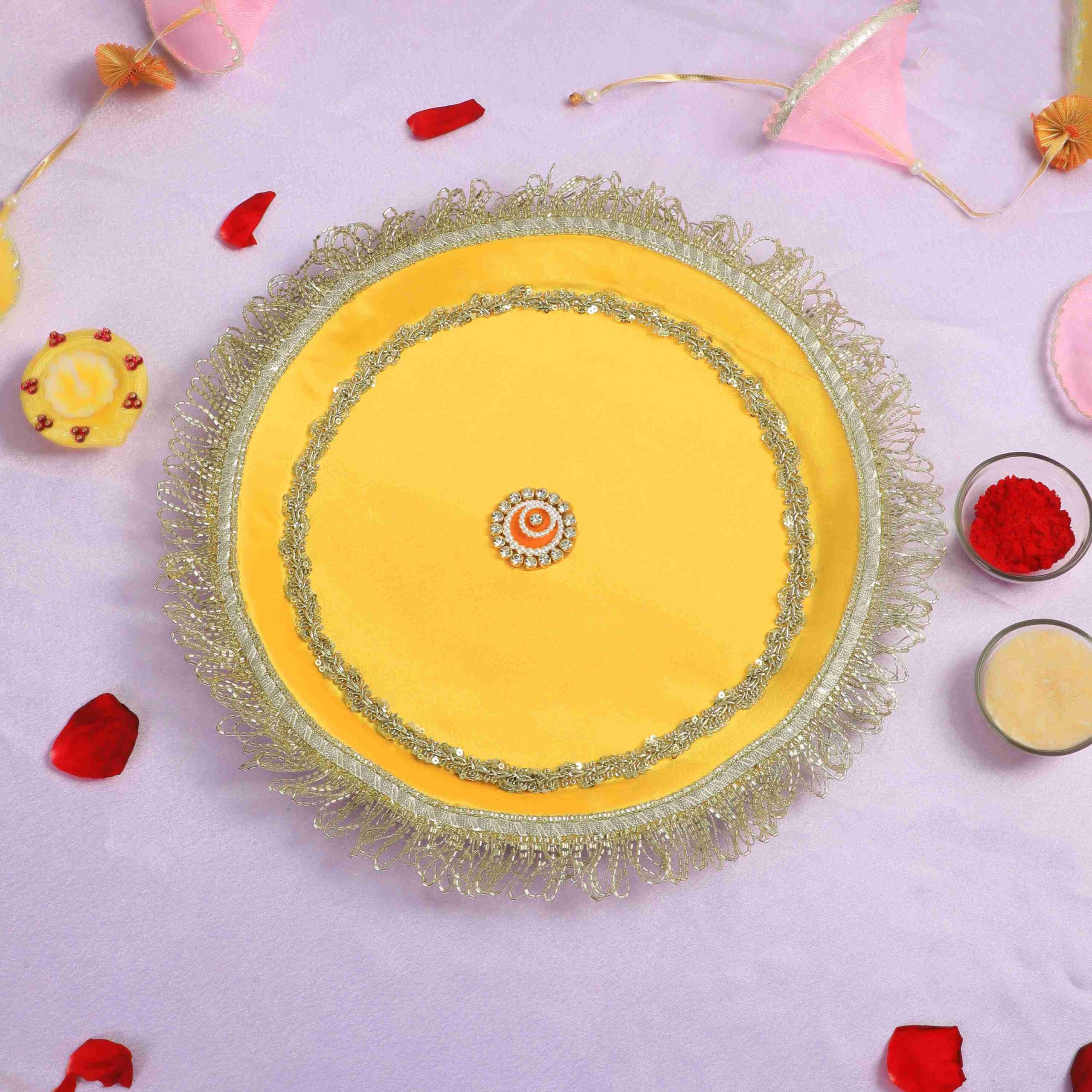 Celebrate Karwa Chauth tradition with the Designer Yellow Karwa Chauth Thali Set, crafted to elevate your ceremonial experience. This set features vibrant yellow tones symbolizing prosperity and joy, thoughtfully designed for functionality and aesthetic appeal. Perfectly sized to hold all essential items like diya, roli, chawal, and sweets, it ensures an organized and elegant ritual setup. Durable and easy to clean, this thali set combines traditional symbolism with expert craftsmanship, making your Karwa Chauth observance both meaningful and beautiful.