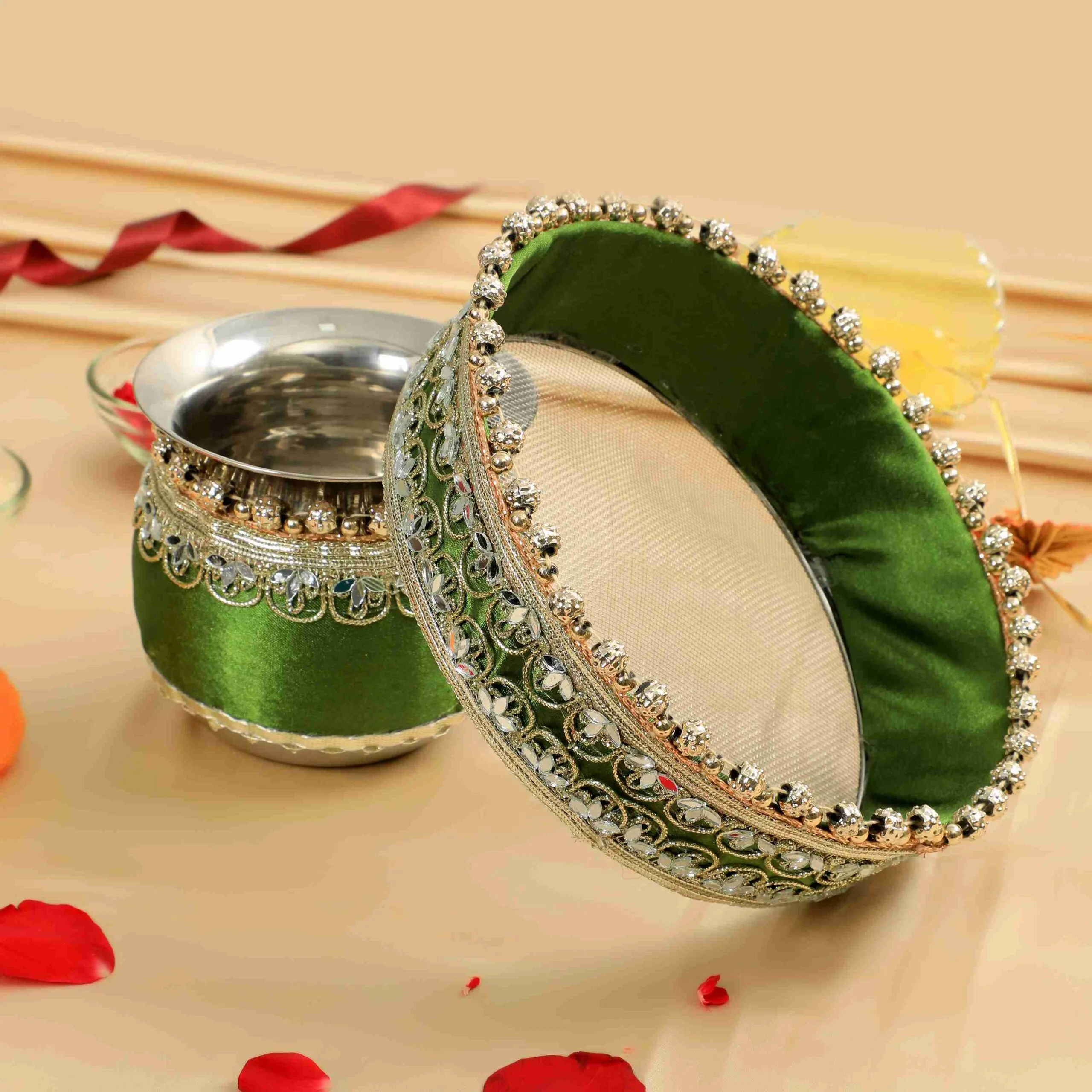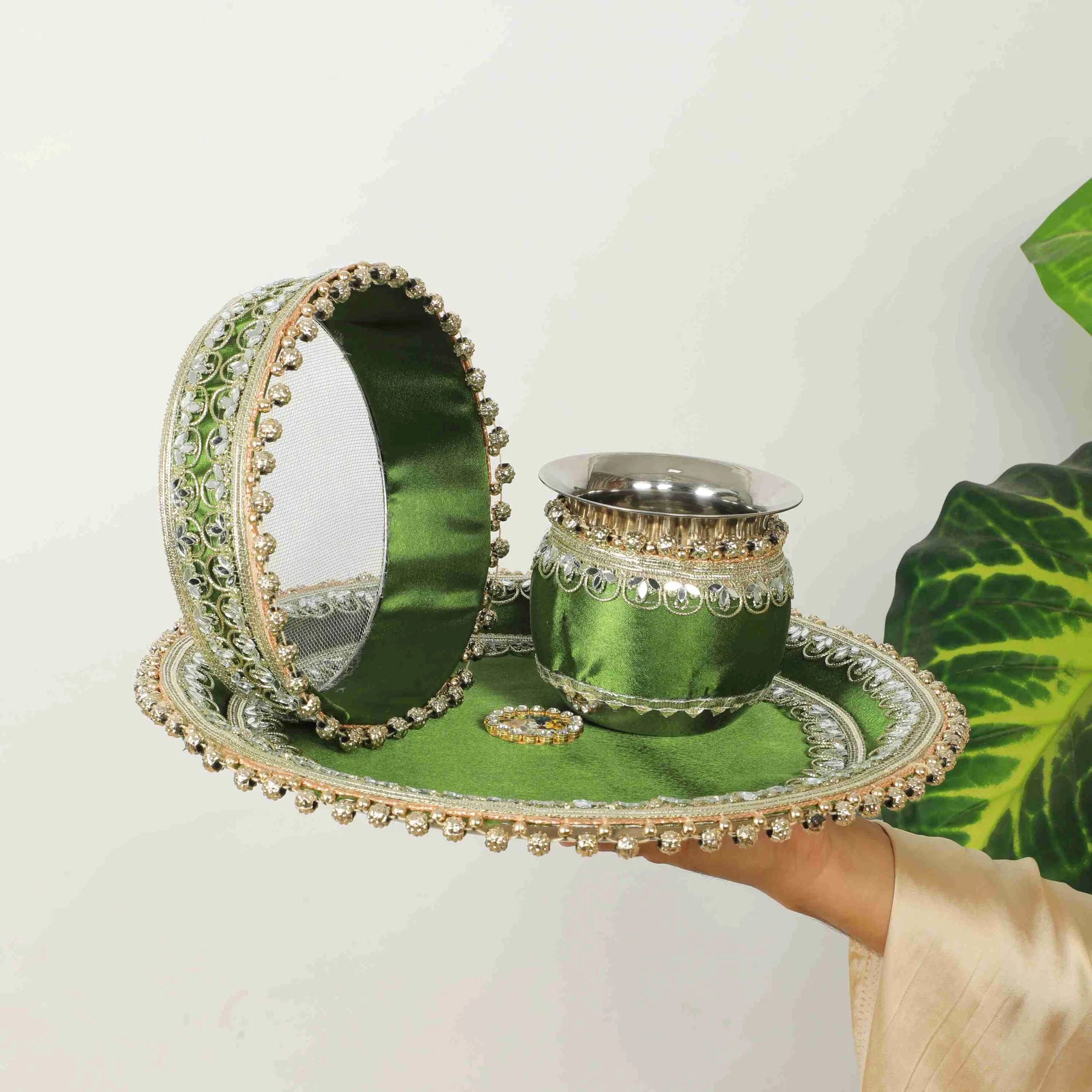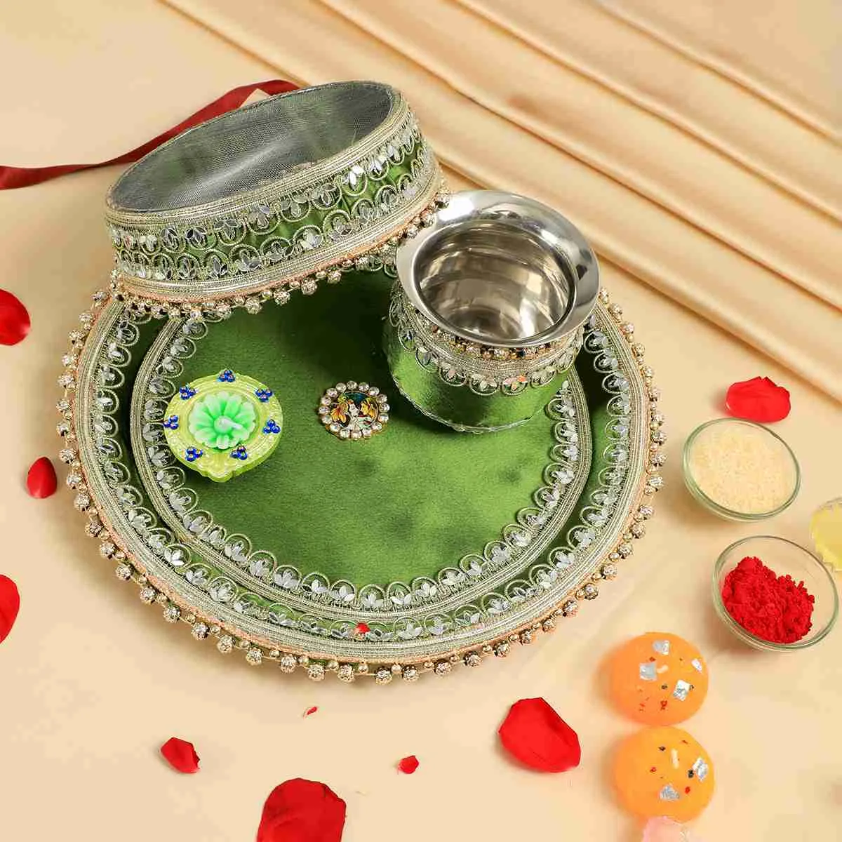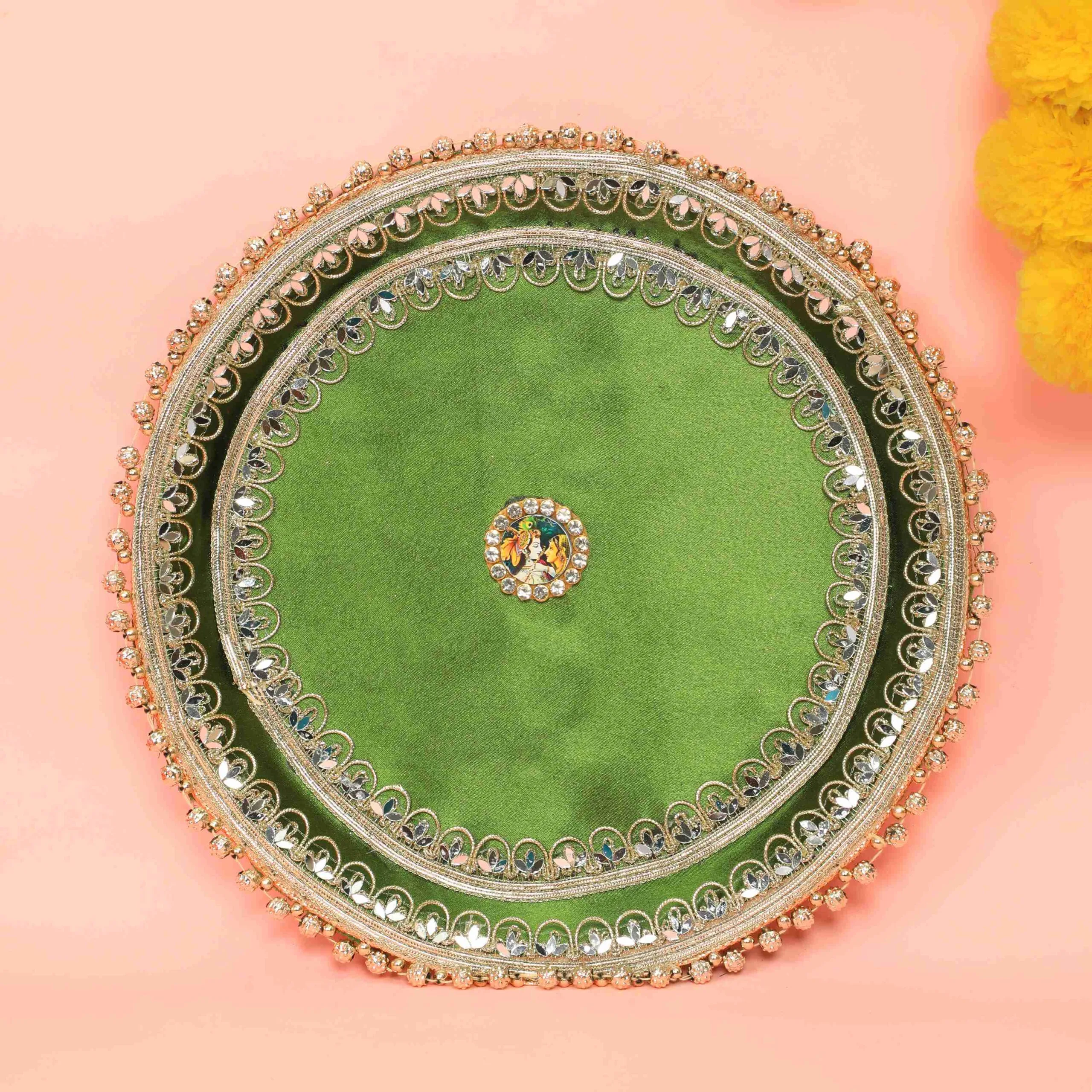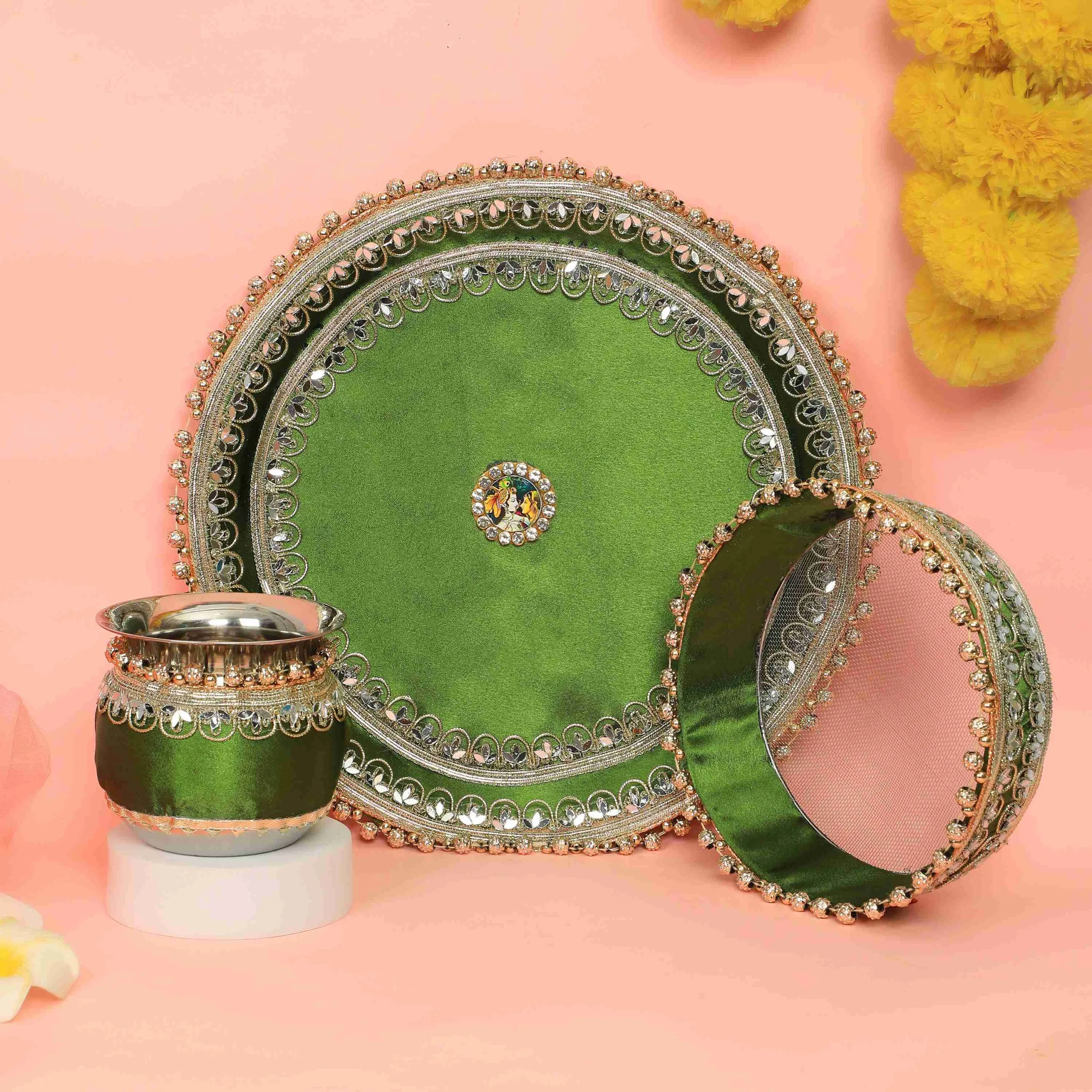 Celebrate this Karwa Chauth with our Elegant Radha Krishna Green Thali Set. This elegant created set revolves around the heavenly pair Radha and Krishna, standing for everlasting love and spiritual balance. Reflecting the rich cultural legacy of the celebration, every element in the thali is painstakingly crafted with vivid colors and minute features. Having all the important pooja items in one beautiful set makes your Karva Chauth celebrations very special and very pretty. Whether for a present or for your own festivities, this thali has class, history, and deep love.