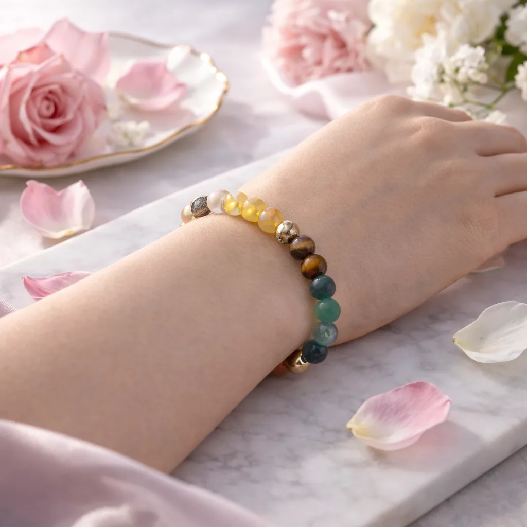 The beads in the bracelet have been carefully combined to offer a balanced energy for wealth creation and stability.
