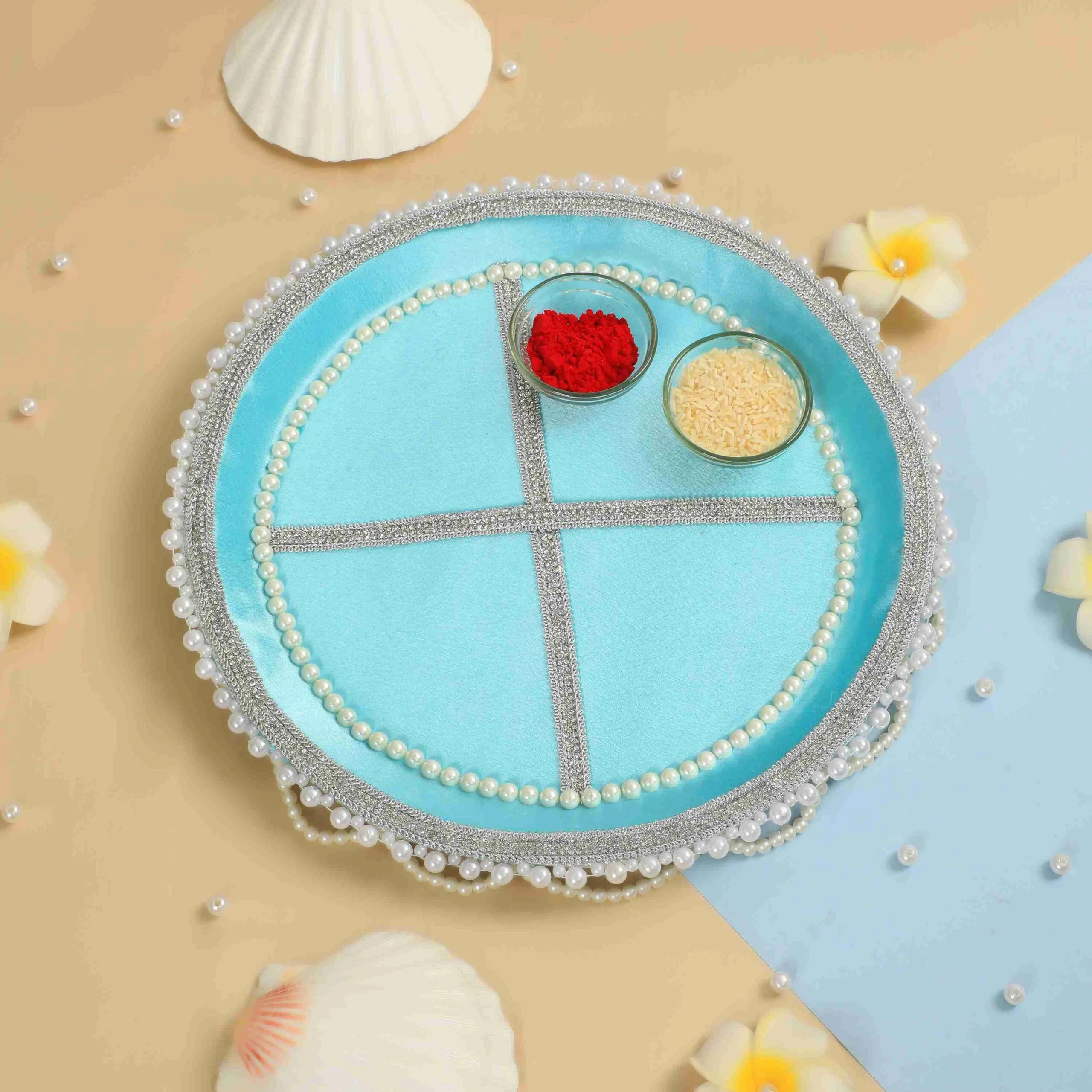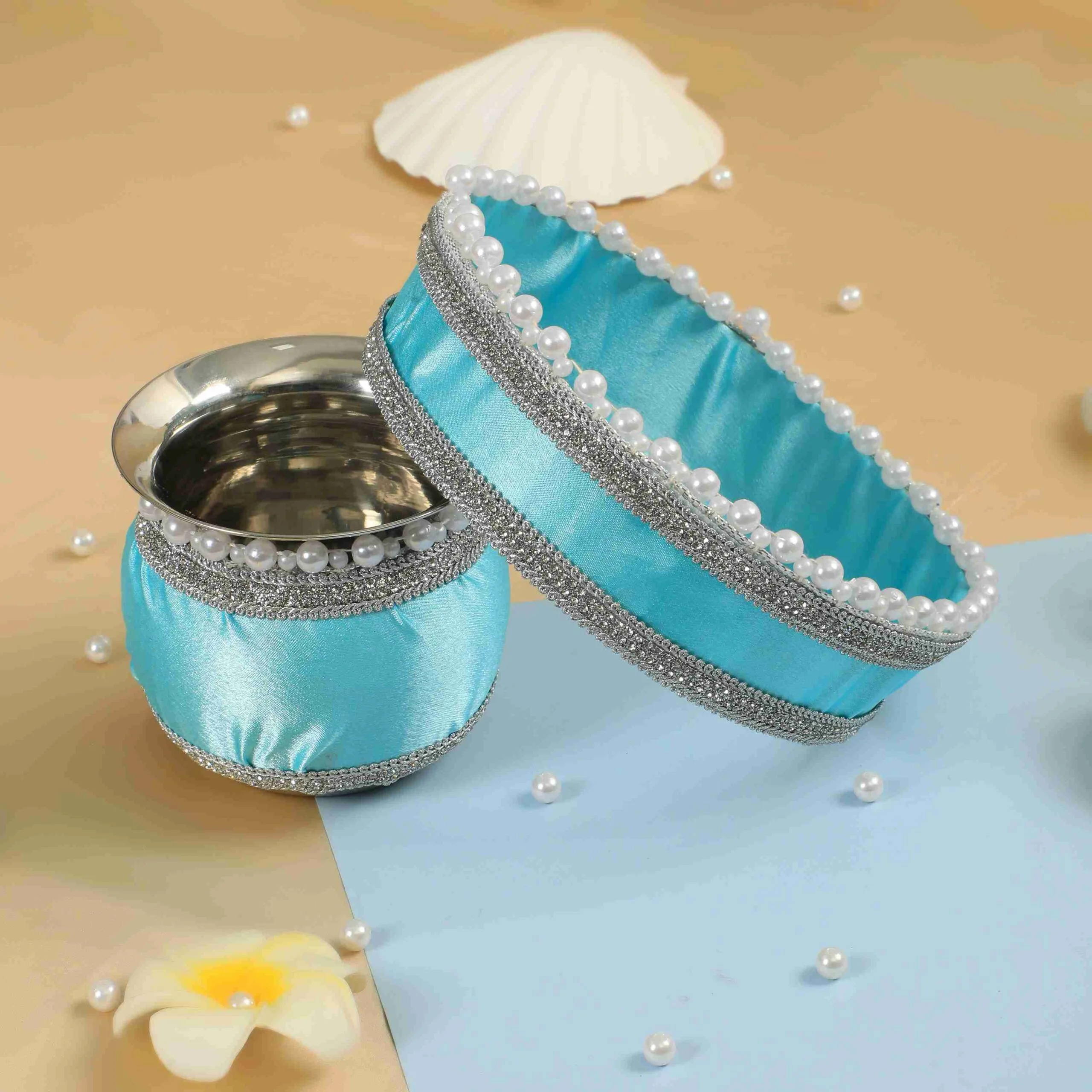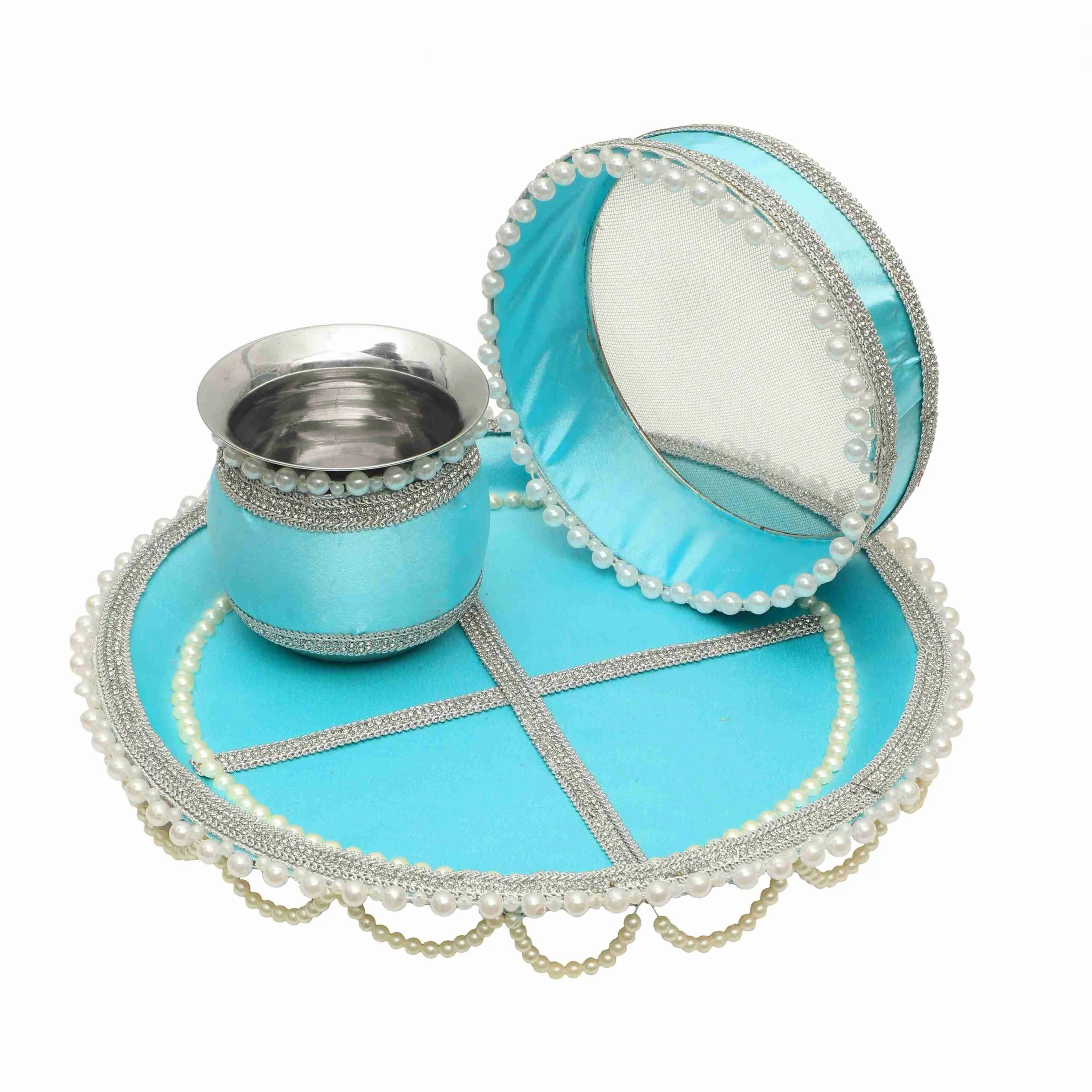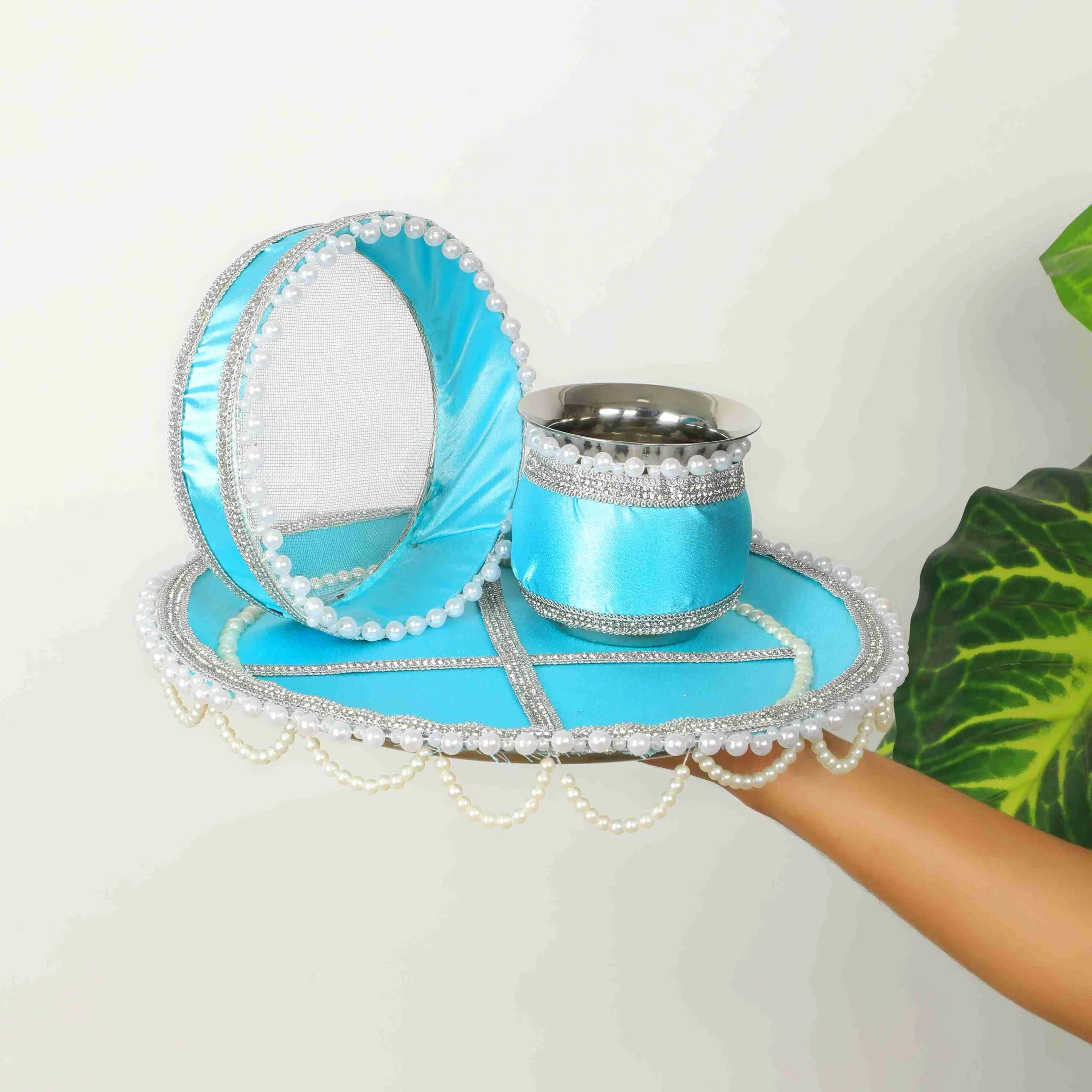 Celebrate Karwa Chauth with this Elegant Handmade Blue Thali Set, designed to enhance your ritual with tradition and style. Crafted with attention to detail, its vibrant blue hue and artisanal finish beautifully complement the ceremonial essentials. This thali set provides a refined and meaningful way to perform the puja, combining elegance with cultural significance.