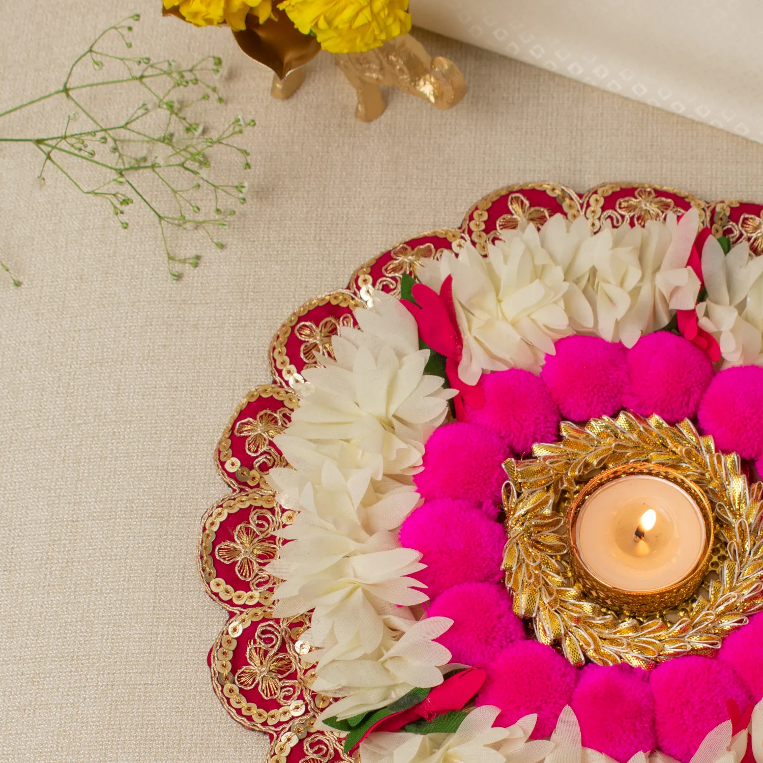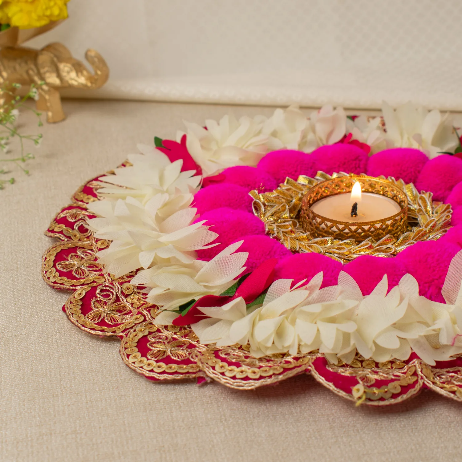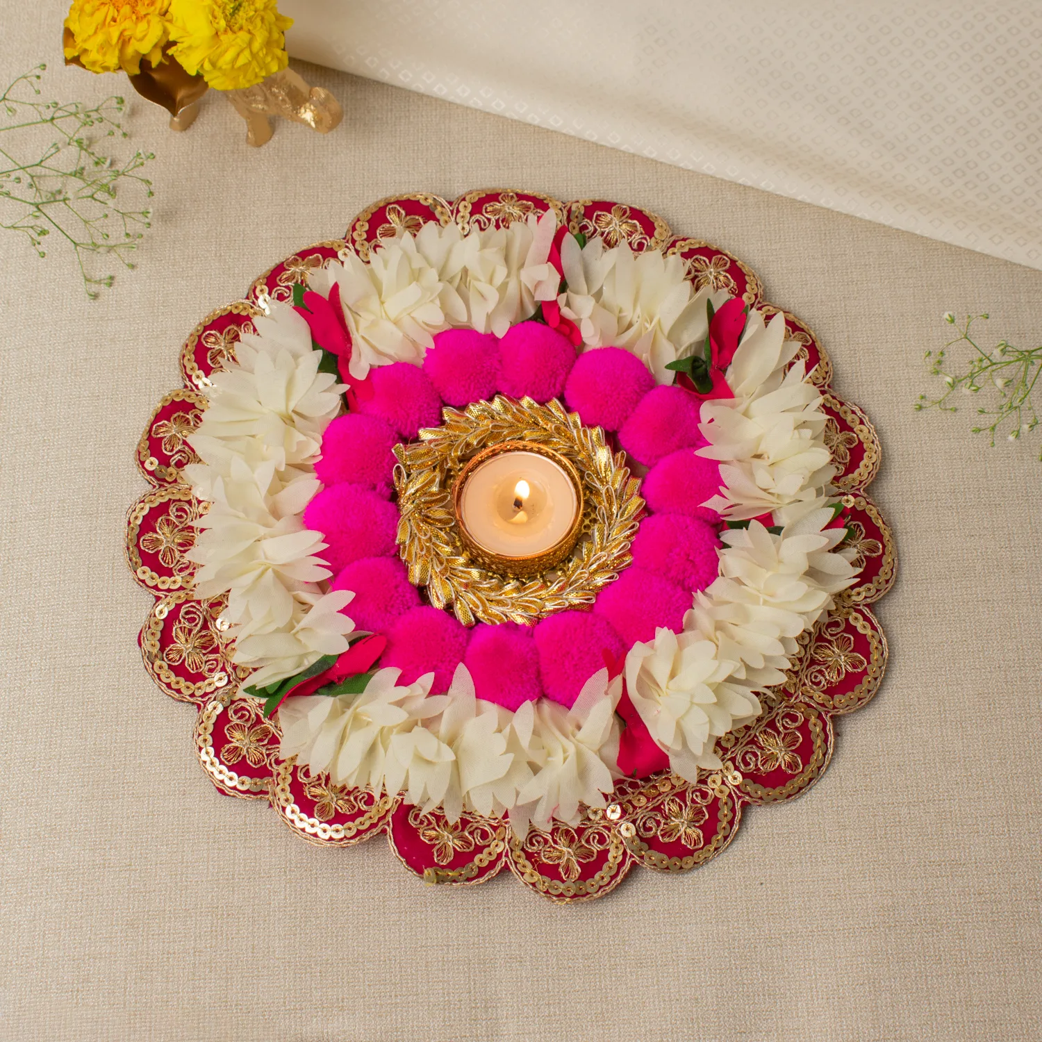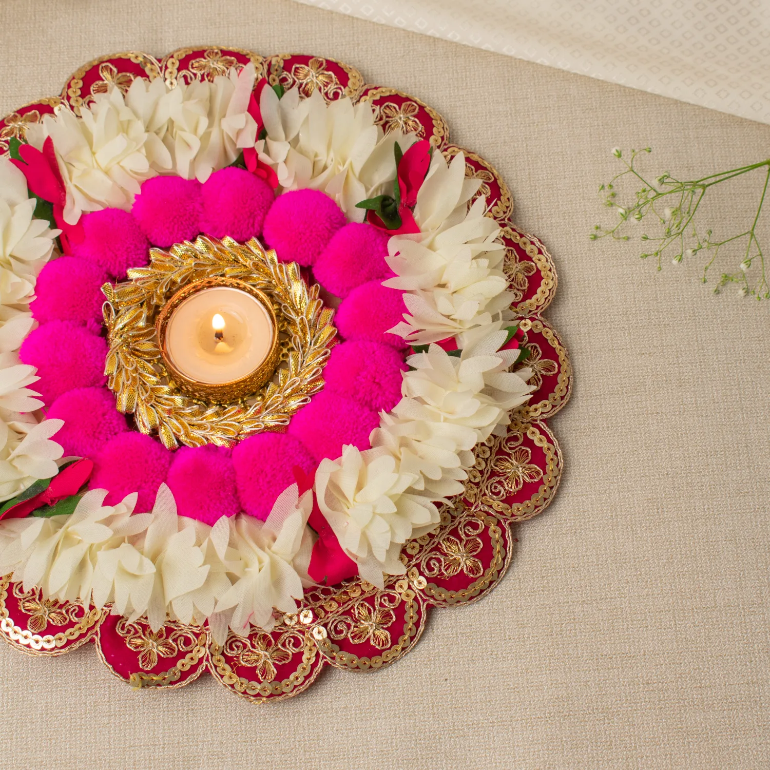 It holds a tealight candle, which emits a remarkable soft glow that is aptly utilized during Diwali decoration, pooja corners, rangoli designs, marriages, and other special occasions. The multi-layered floral patterns with embroidered designs add entirely to the beauty, thereby serving as an excellent centerpiece to be placed on floors, tables, or entrances.