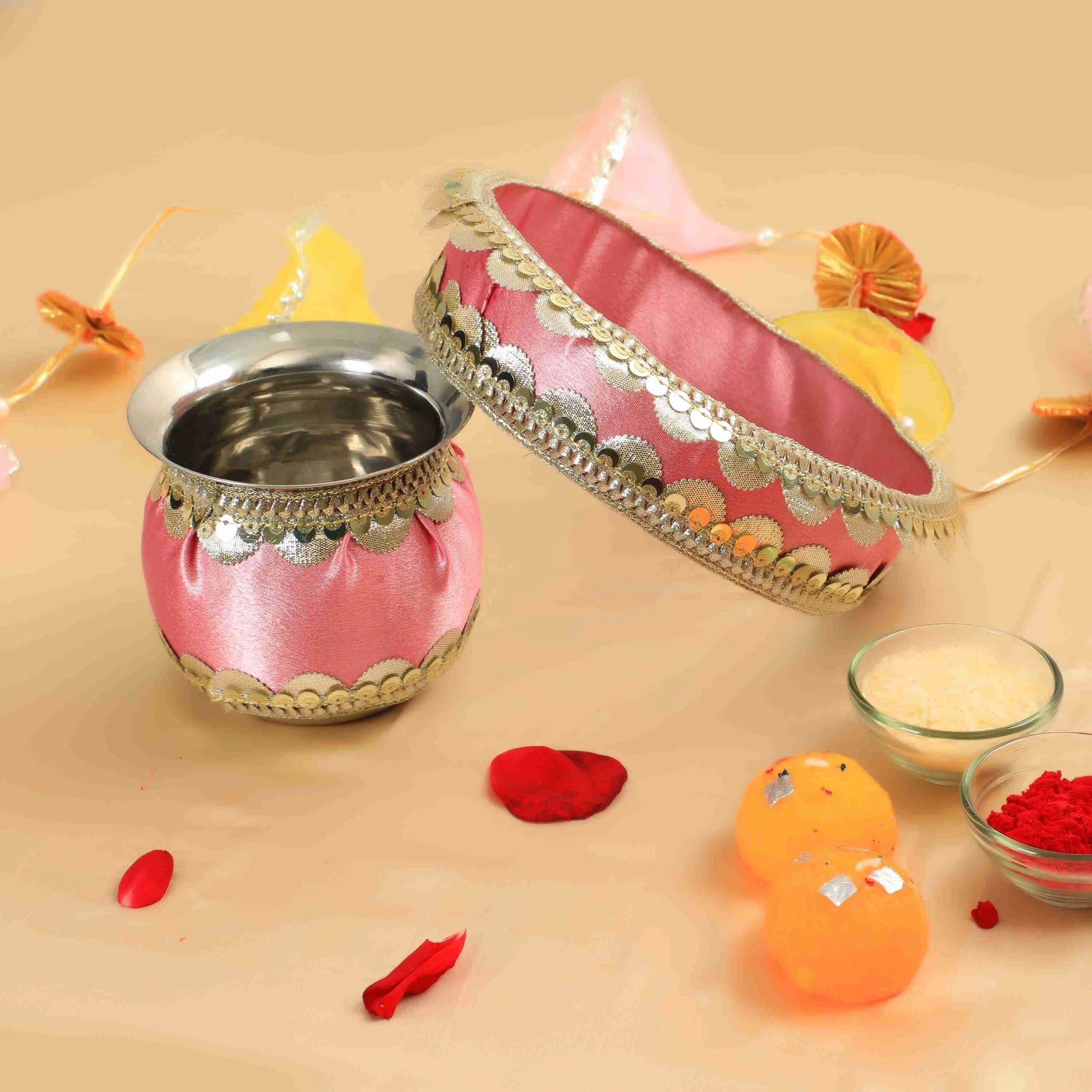 Celebrate Karwa Chauth with the Elegant Lavender Karwa Chauth Thali Set, designed to enhance your festive rituals. This thoughtfully crafted set features a serene lavender hue that symbolizes tranquility and grace. Each piece is made to aid in performing traditional ceremonies smoothly, combining aesthetic appeal with practical use. Perfect for creating a sacred and beautiful atmosphere, this thali set ensures your observance is both meaningful and elegant.