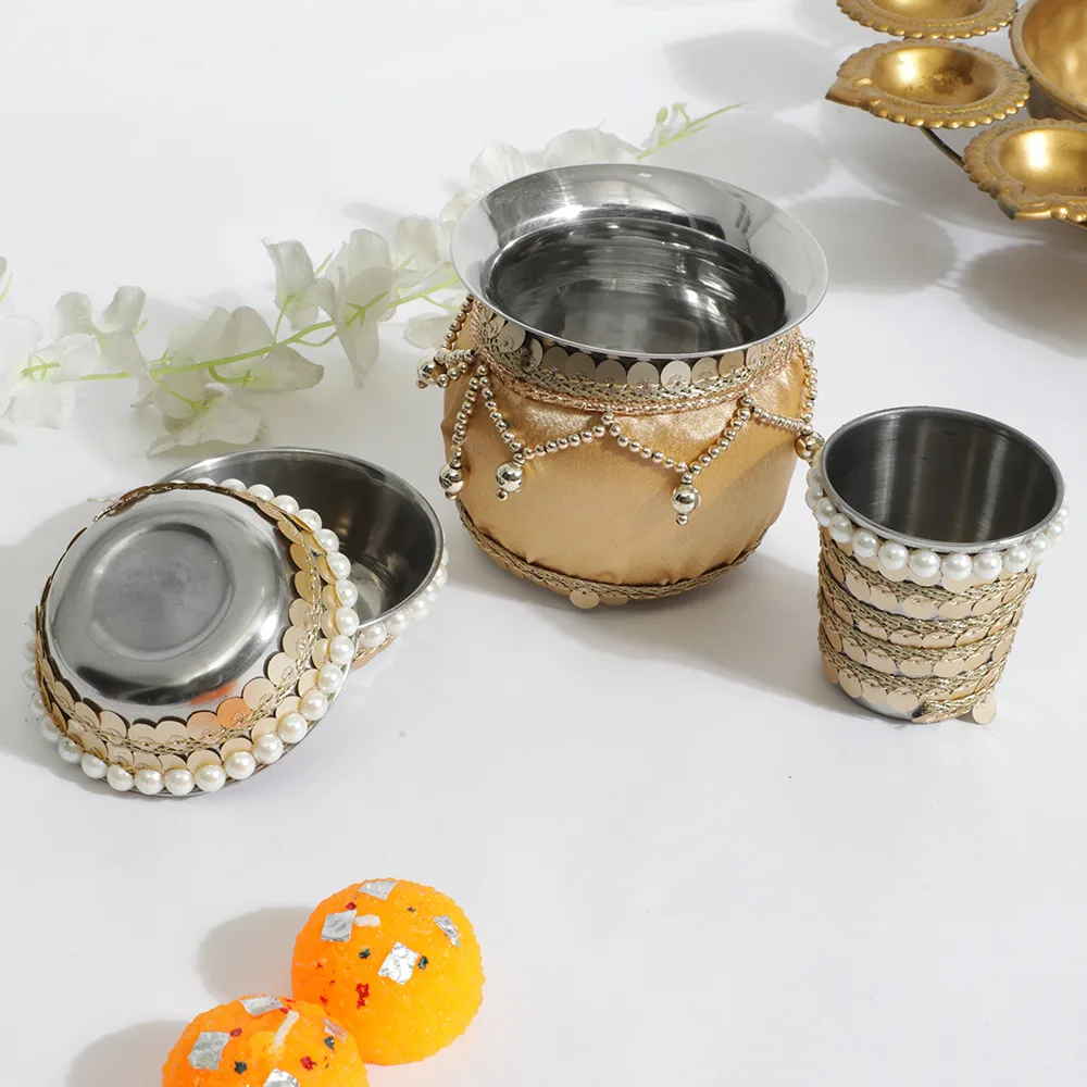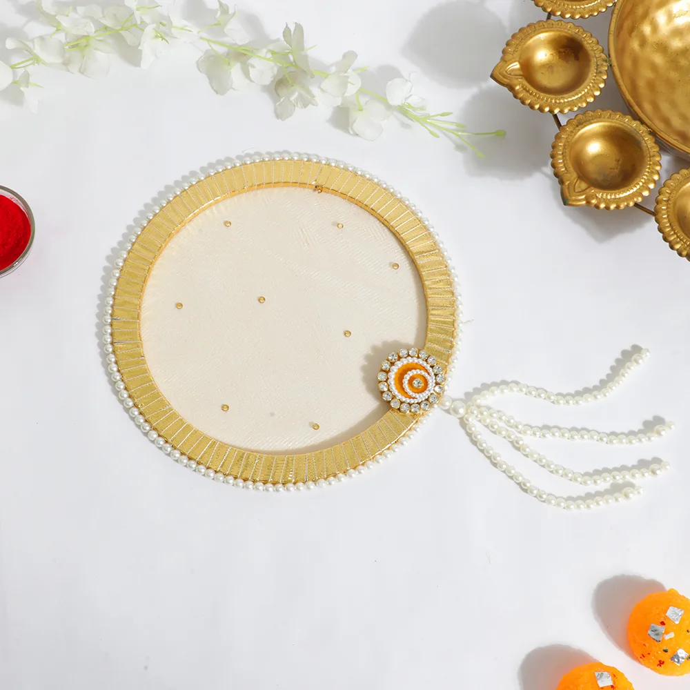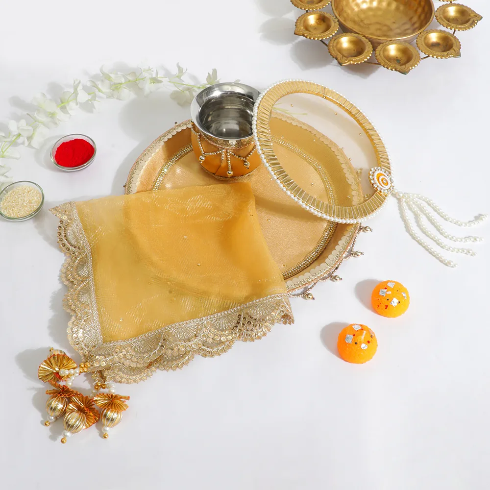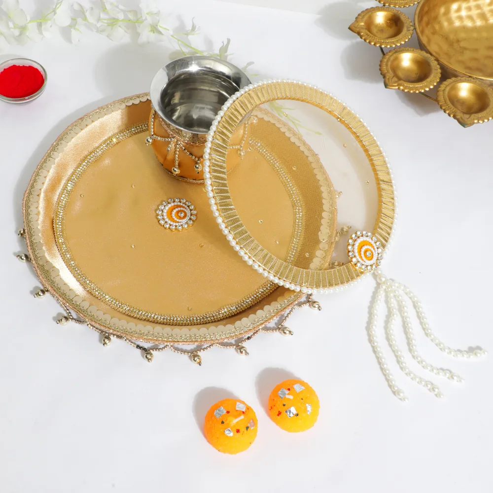 With our Elegant Pear Golden Karwa Chauth Thali Set, honor custom in a hint of luxury. Beautifully crafted, this set has golden accents matched with delicate pearl decorations that give your holiday ritual a graceful feel. This set elegantly combines rich history with modern flair and comes with all the basics for pooja, including a thali, lota, and sieve. Ideal for bringing beauty and warmth to your Karwa Chauth festivities, therefore transforming every event into something unique and unforgettable.