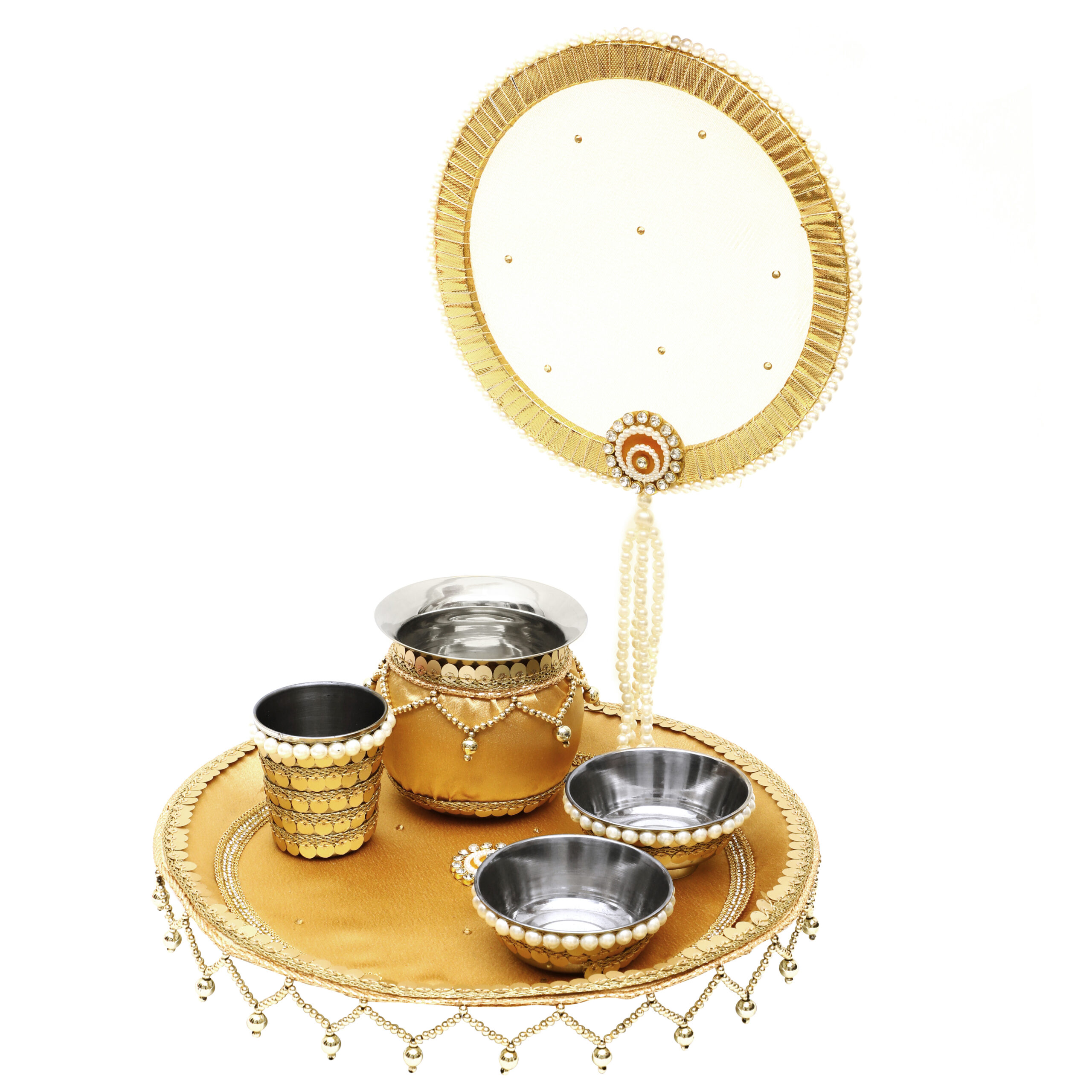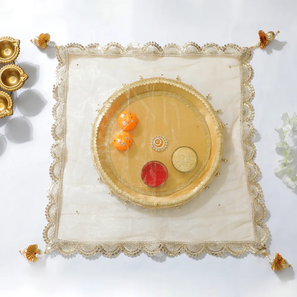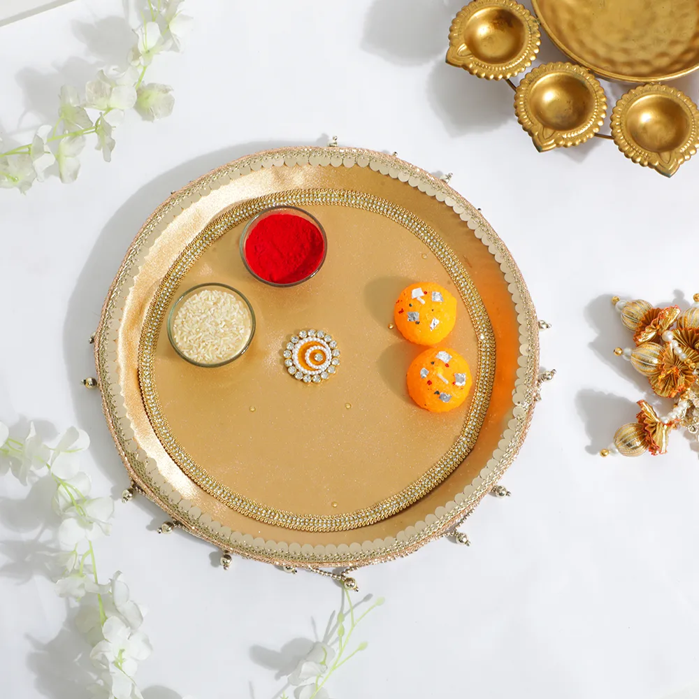 With our Elegant Pear Golden Karwa Chauth Thali Set, honor custom in a hint of luxury. Beautifully crafted, this set has golden accents matched with delicate pearl decorations that give your holiday ritual a graceful feel. This set elegantly combines rich history with modern flair and comes with all the basics for pooja, including a thali, lota, and sieve. Ideal for bringing beauty and warmth to your Karwa Chauth festivities, therefore transforming every event into something unique and unforgettable.