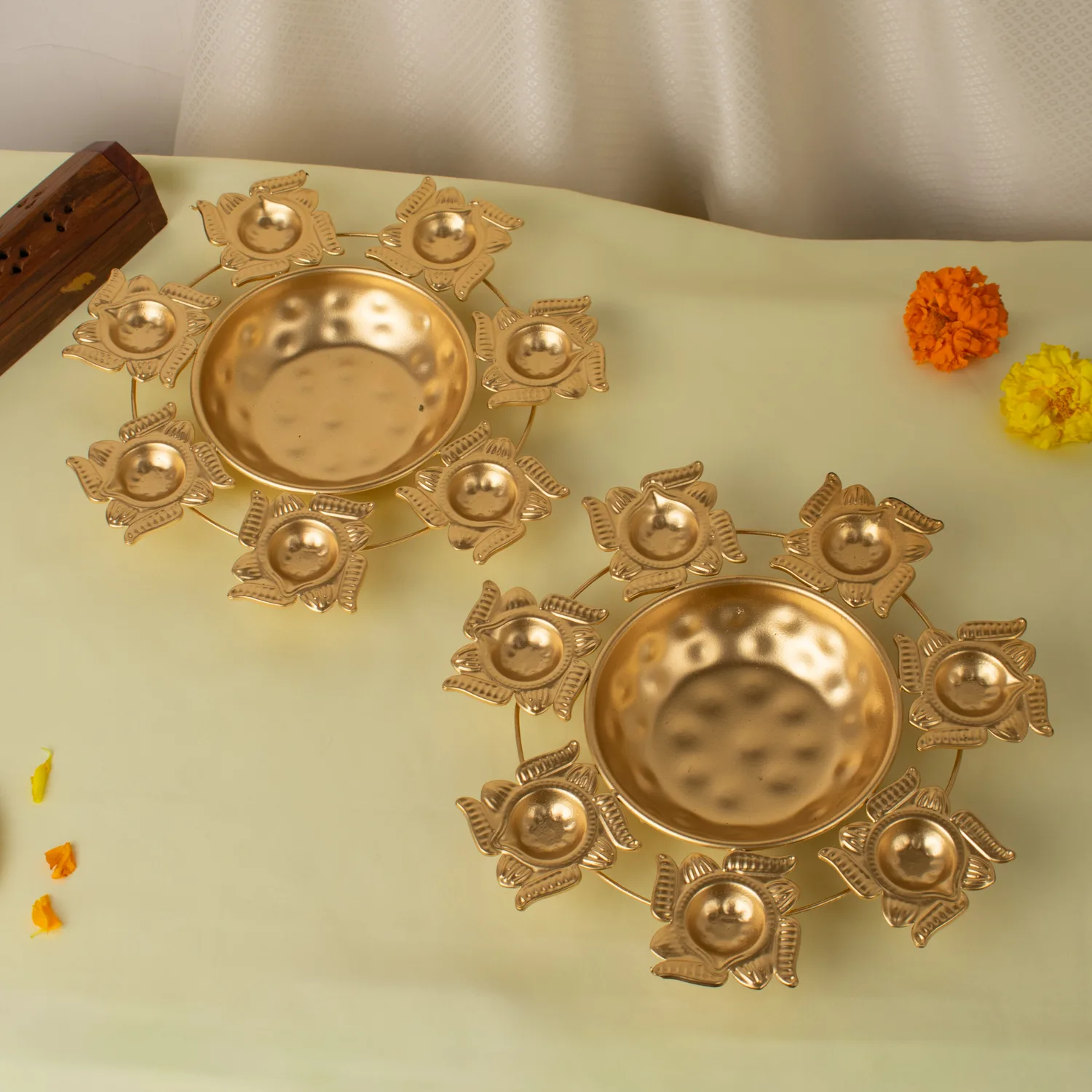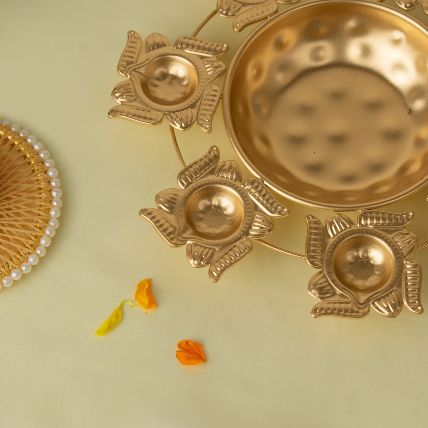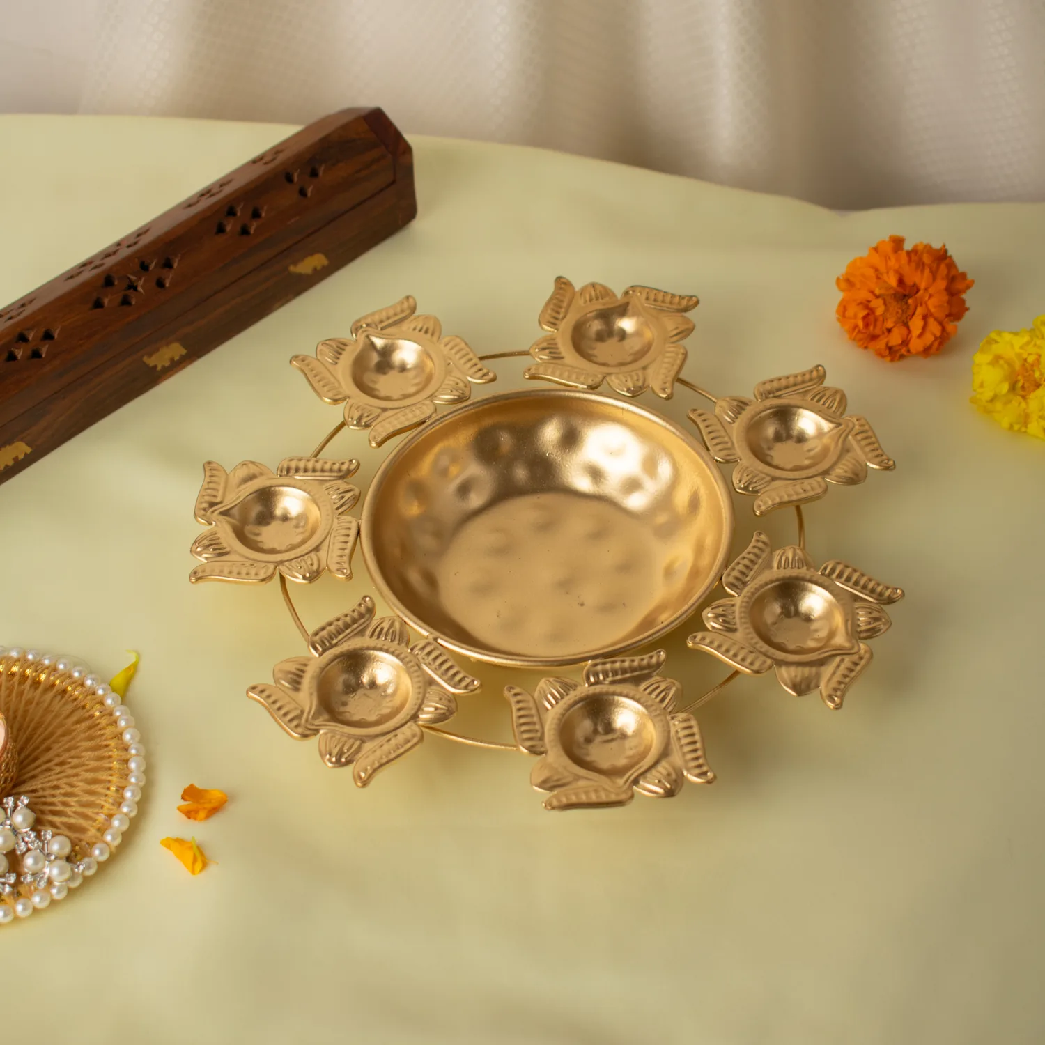 Finished in a rich golden color, this diya thali set is sure to help you light up the ambiance of your pooja room or mandir. Designed in such a manner that it allows light to spread evenly because of multiple diyas lit together in the set.