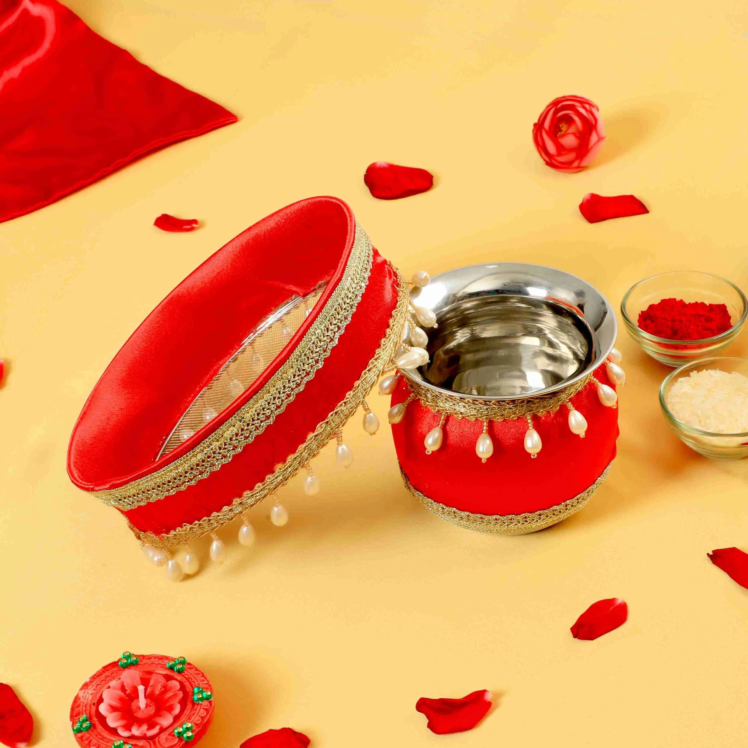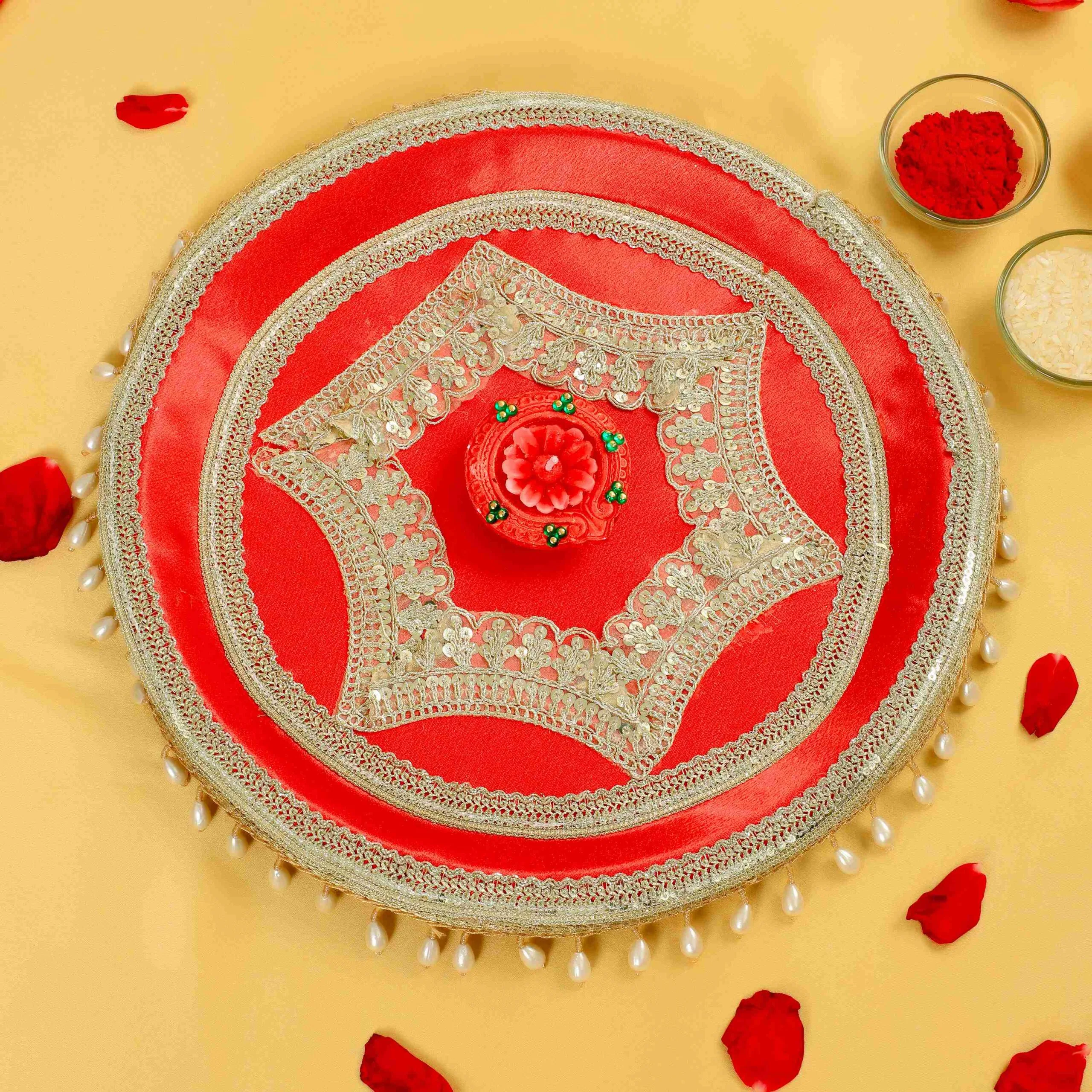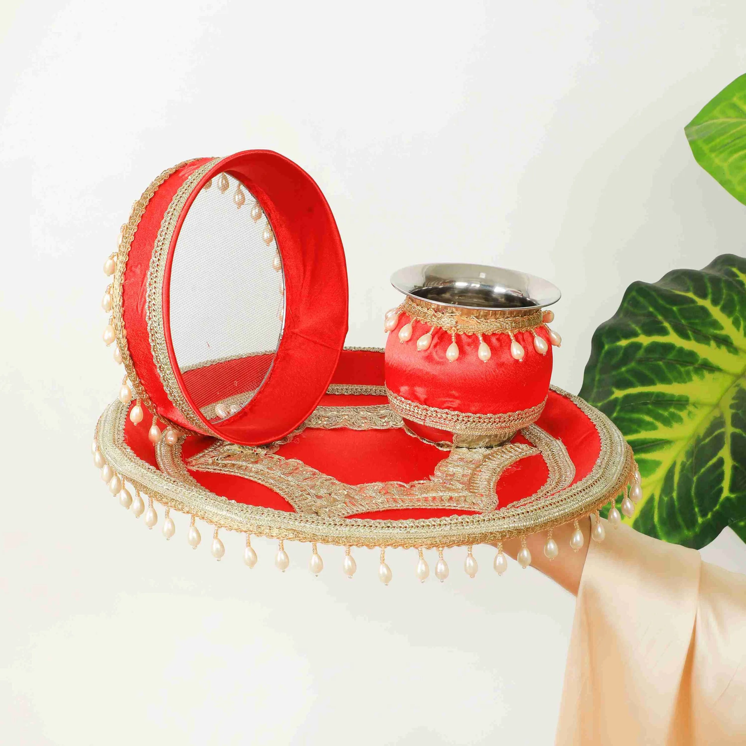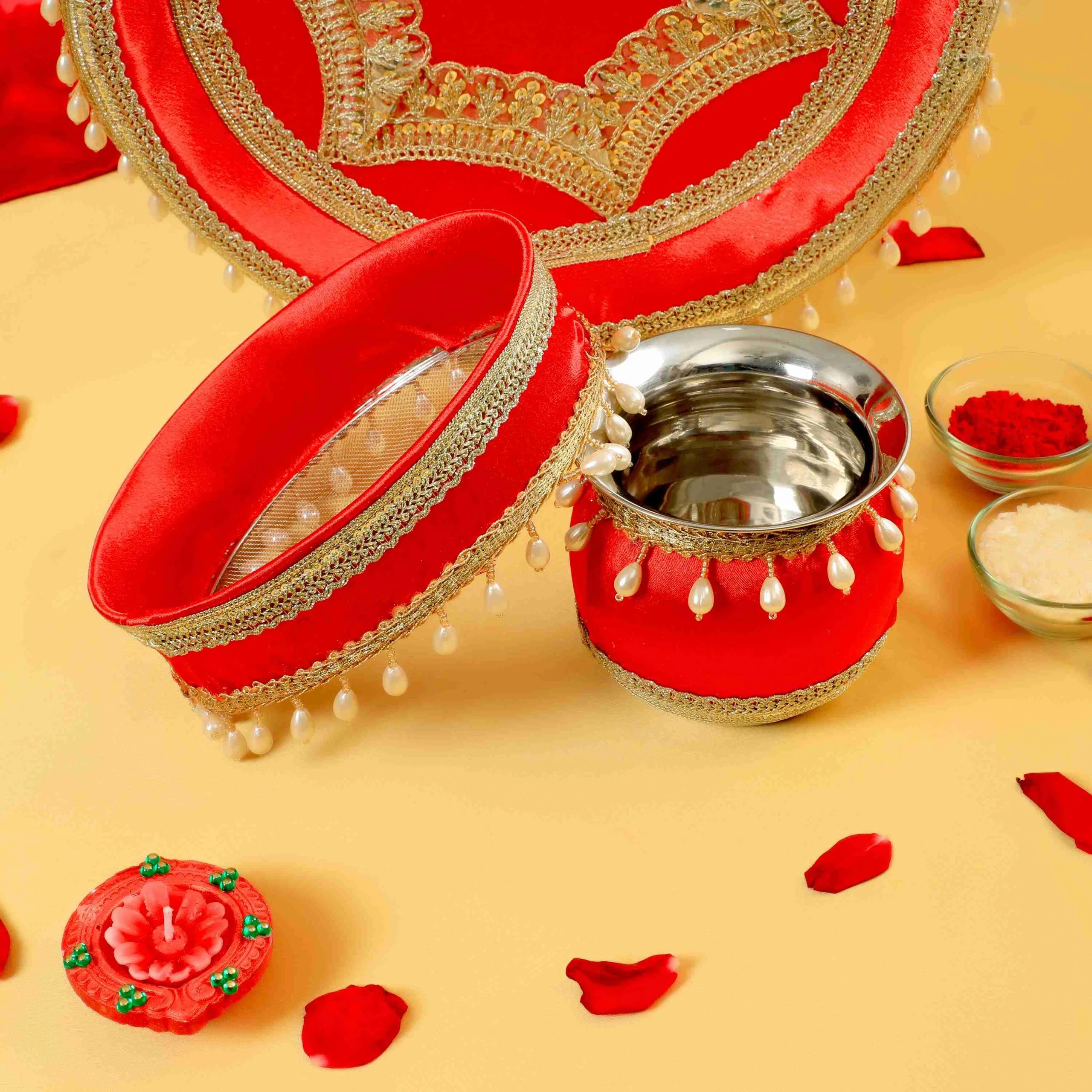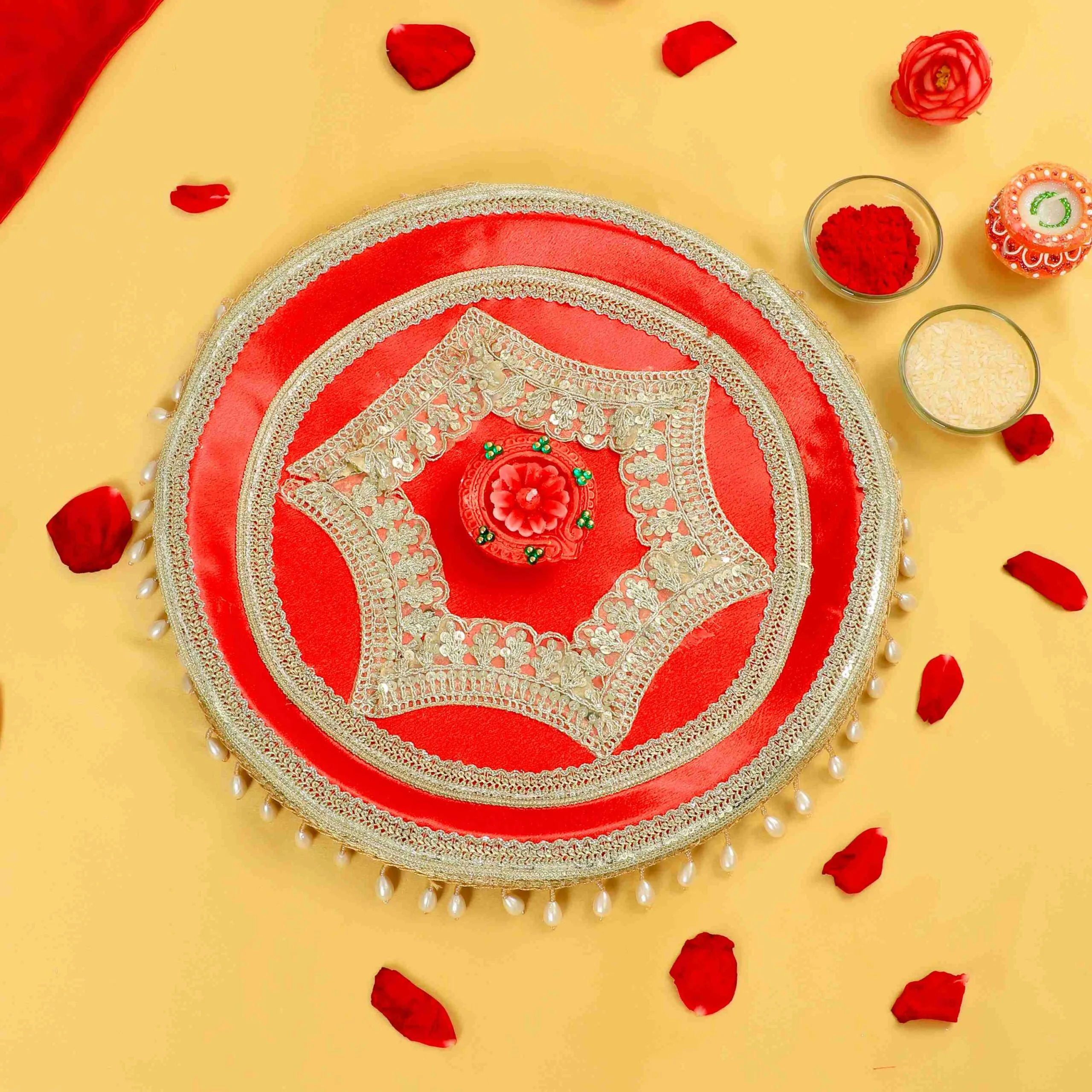 Celebrate the traditional Karwa Chauth with this Designer Yellow Thali Set, crafted to enhance your festive ritual. The vibrant yellow hue symbolizes prosperity and joy, while the elegant design adds a refined touch to your ceremonial setup. This thali set combines aesthetic appeal with cultural significance, offering a perfect blend of tradition and style for an auspicious celebration.
