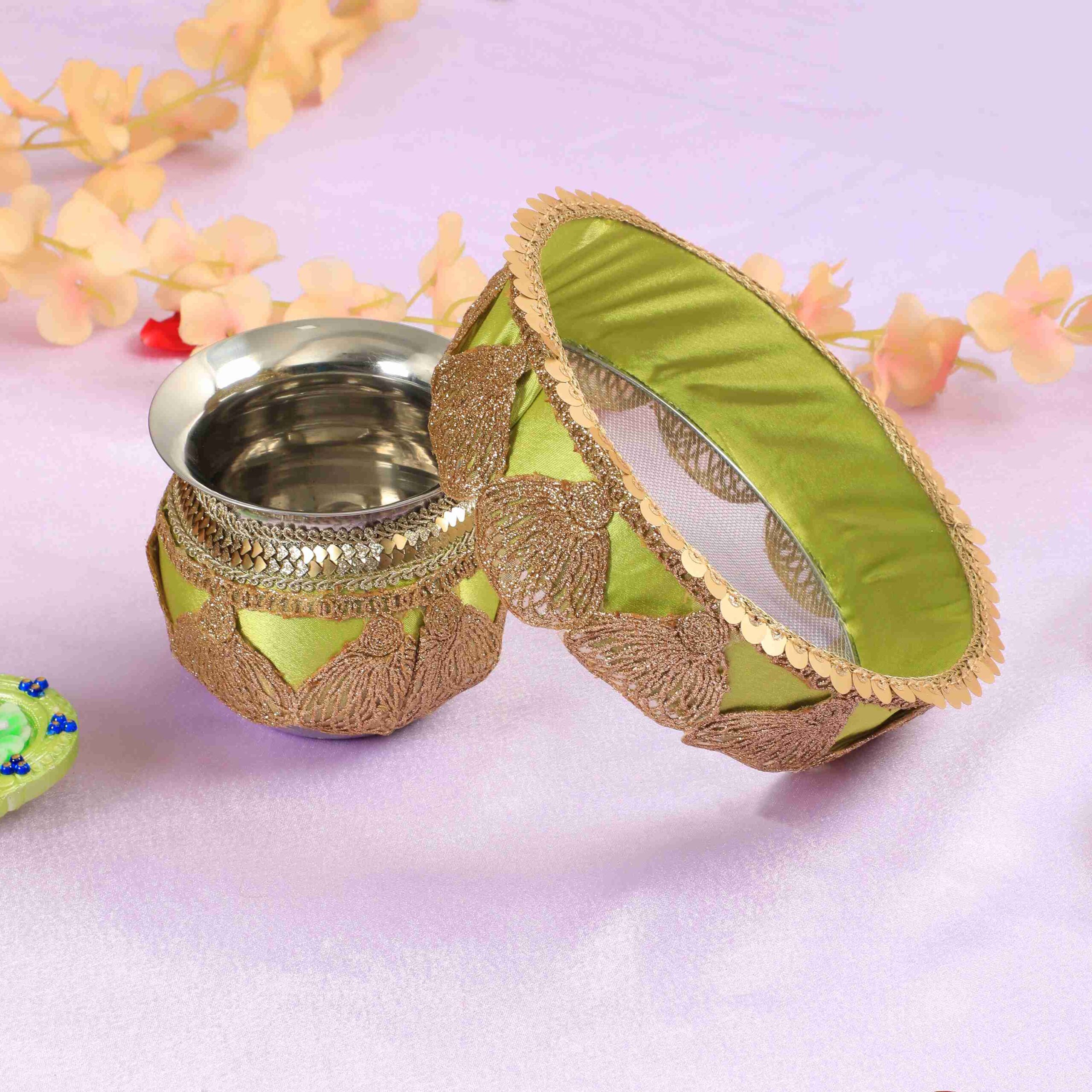 Celebrate Karwa Chauth with this Luxury Green Karwa Chauth Thali Set, designed to elevate your traditional rituals. Crafted with elegant green accents, this set includes essential items for the puja, combining beauty with functionality. Its premium build ensures durability and a sophisticated look, making your celebration both meaningful and stylish. Perfect for a memorable festival experience.