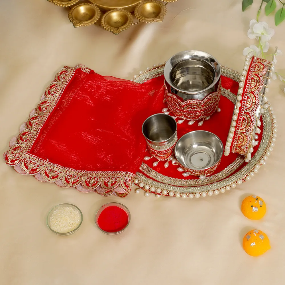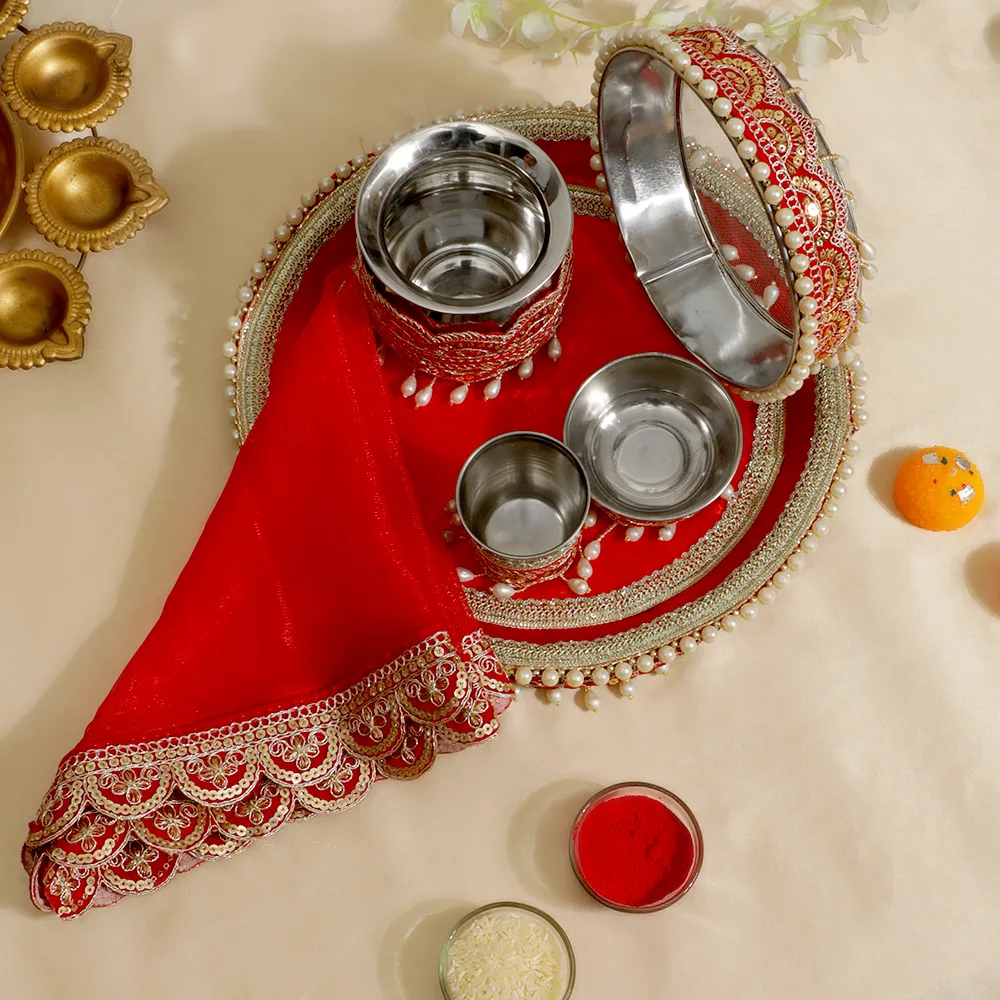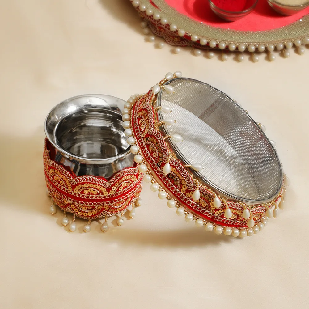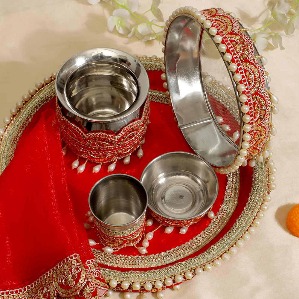 With our Luxury Red Pearl Karwa Chauth Thali Set, elegantly and traditionally celebrate Karwa Chauth. A wonderfully designed thali with delicate pearl embellishments and exquisite gold embellishments distinguishes this gorgeous set. Included are fundamental tools like a sieve and a coordinating lota meant to improve the holy pooja ceremony. Made from premium materials with a large and well-organized design, this set has a festive luxury and classic beauty. Ideal for giving your big day a dash of elegance and grace, ensuring that every moment is really remarkable.