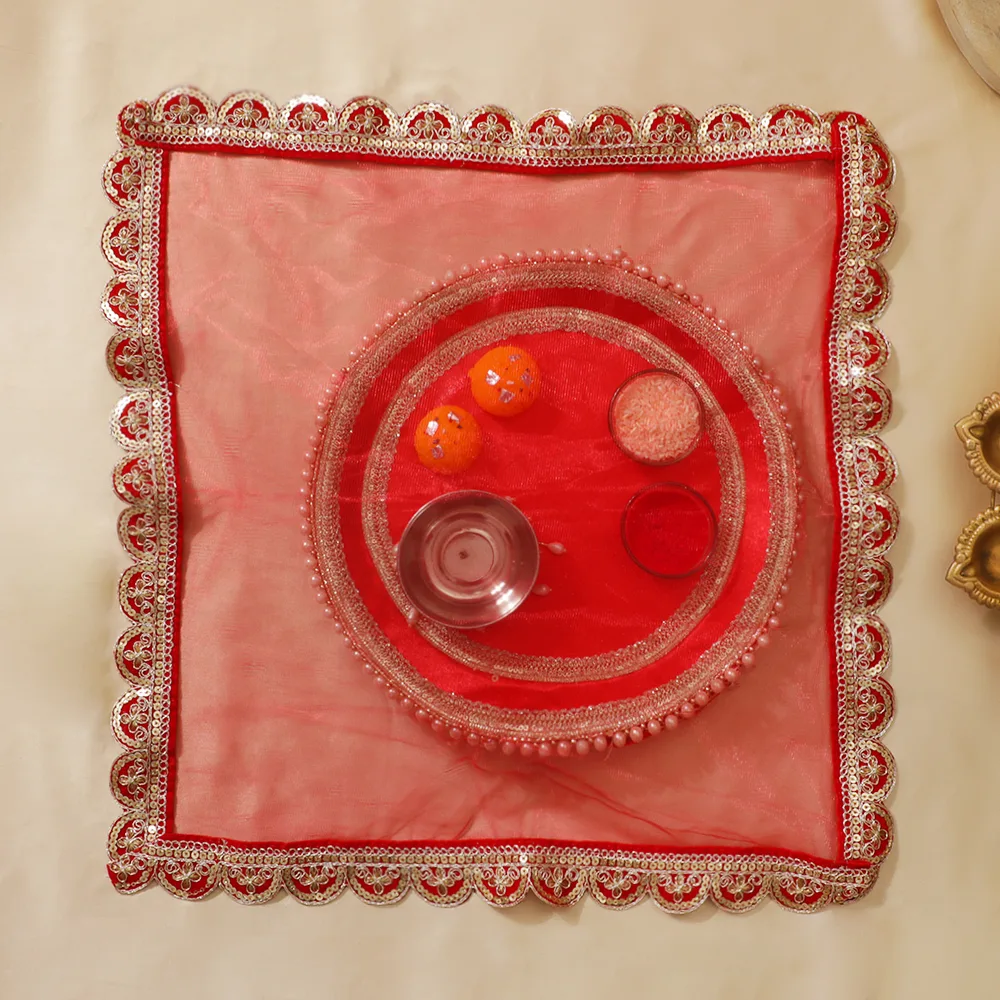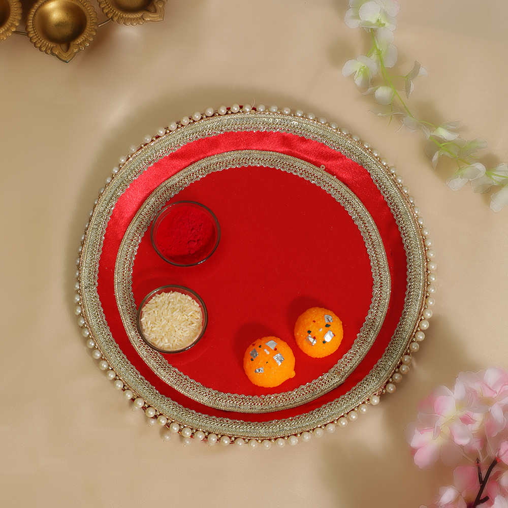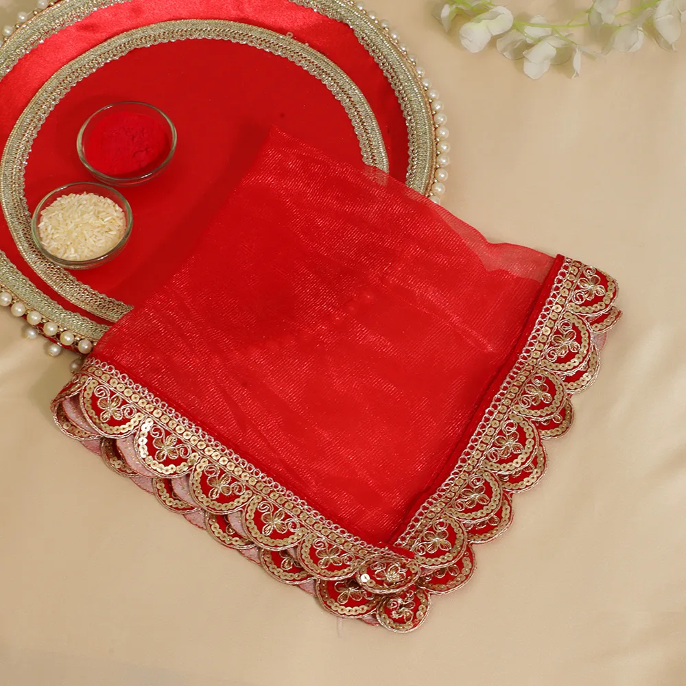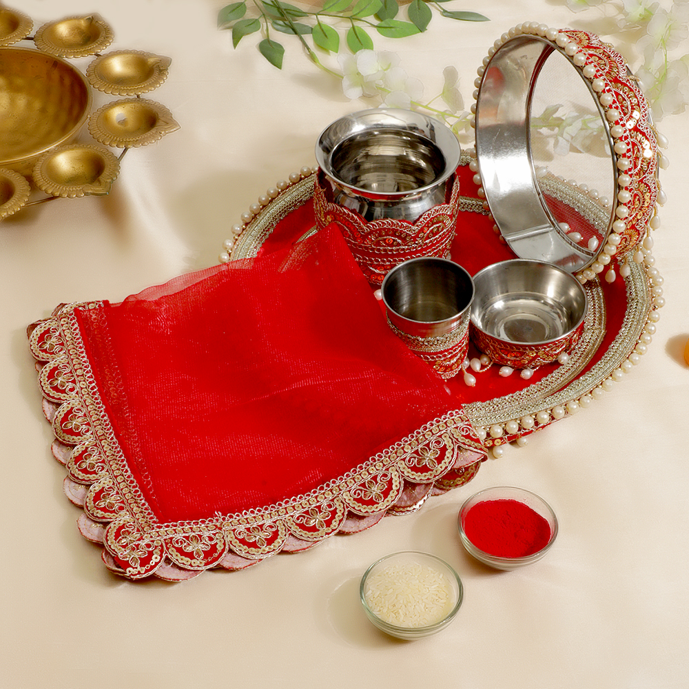 With our Luxury Red Pearl Karwa Chauth Thali Set, elegantly and traditionally celebrate Karwa Chauth. A wonderfully designed thali with delicate pearl embellishments and exquisite gold embellishments distinguishes this gorgeous set. Included are fundamental tools like a sieve and a coordinating lota meant to improve the holy pooja ceremony. Made from premium materials with a large and well-organized design, this set has a festive luxury and classic beauty. Ideal for giving your big day a dash of elegance and grace, ensuring that every moment is really remarkable.