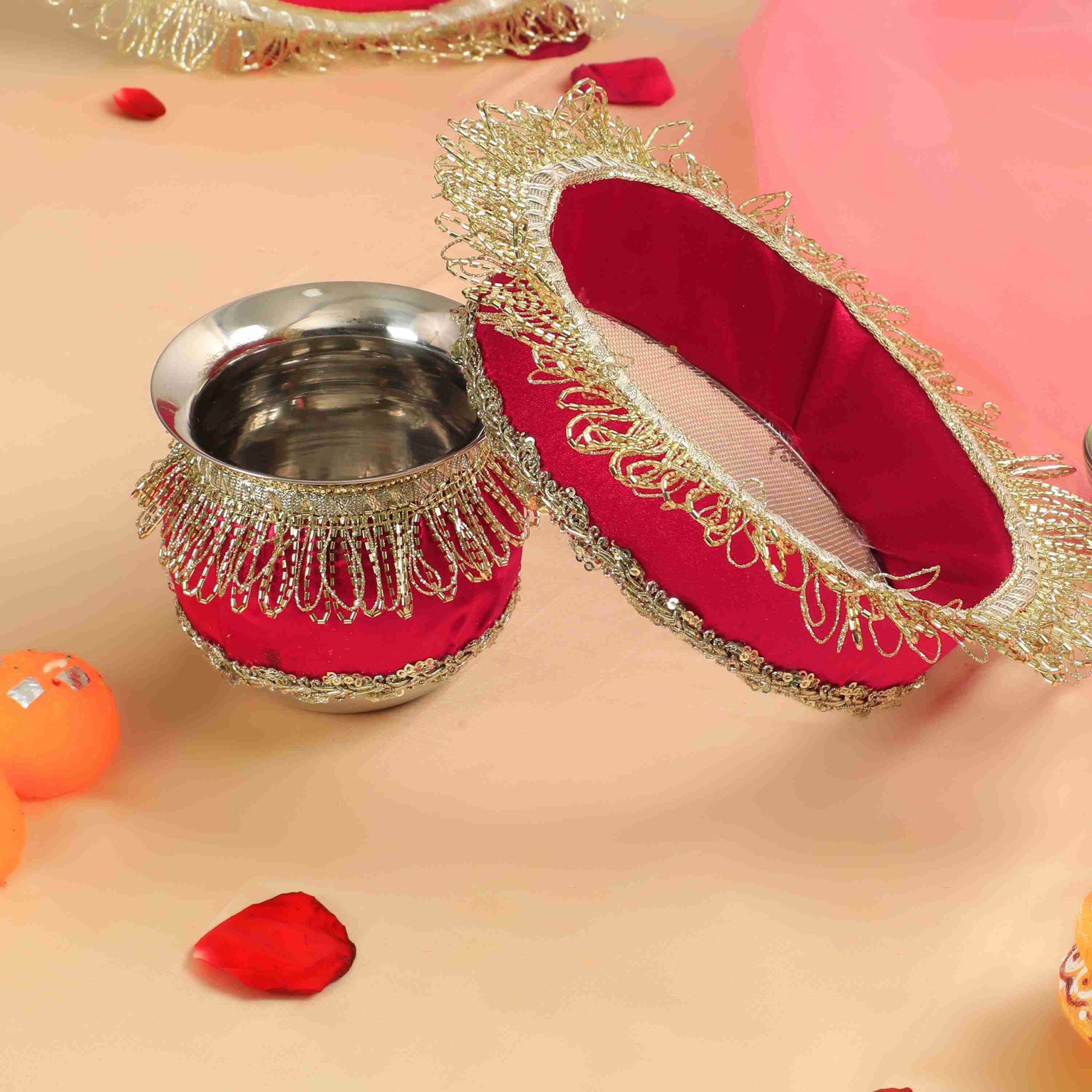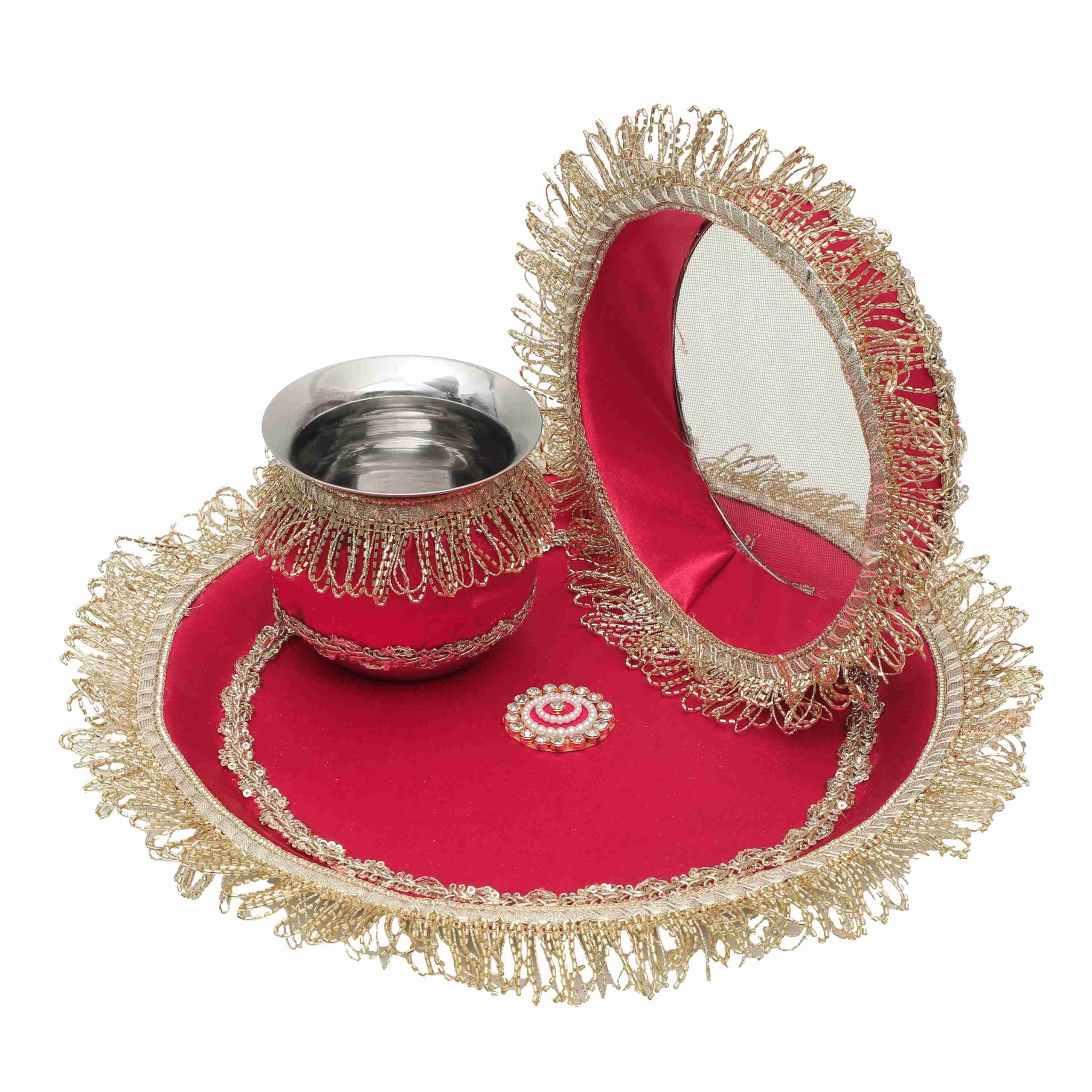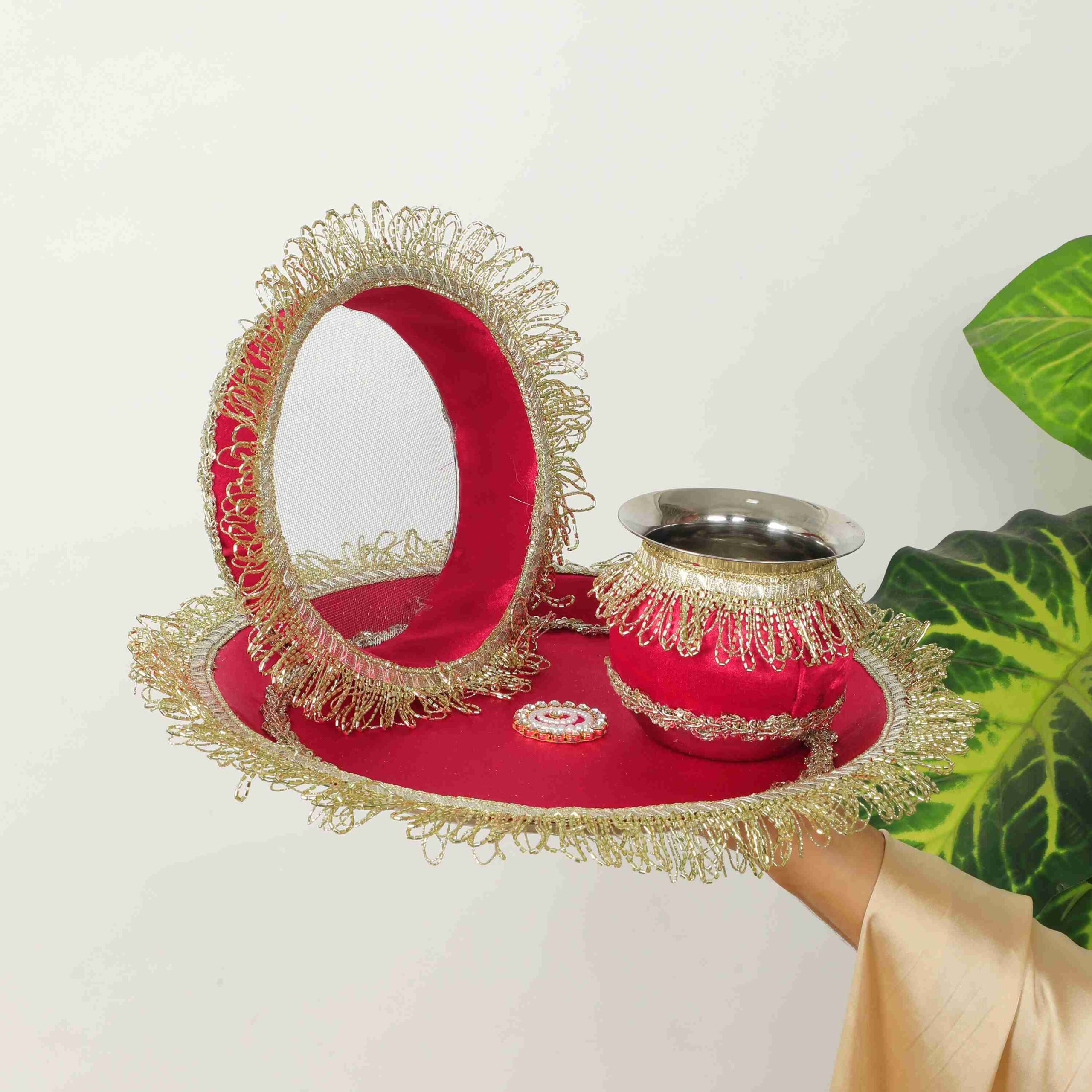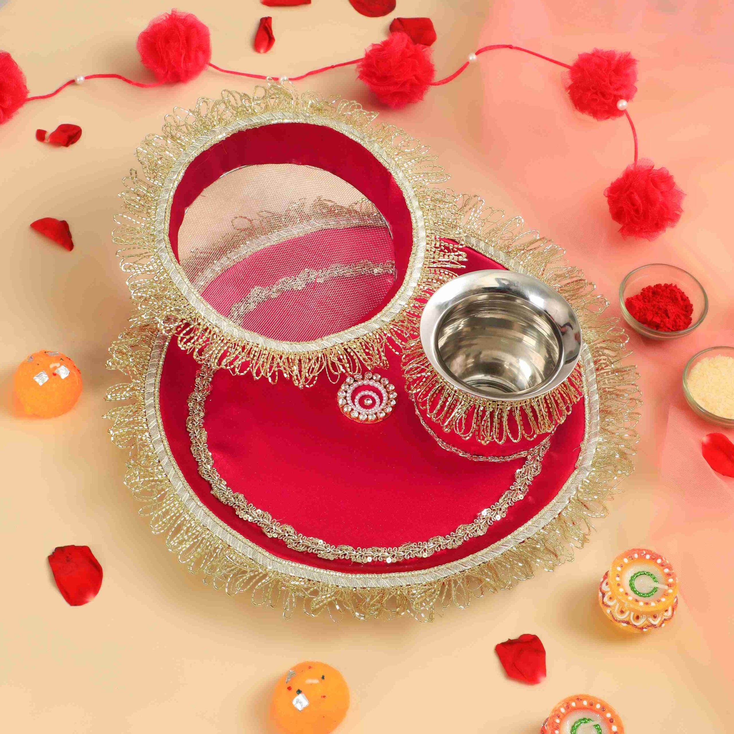 Celebrate Karwa Chauth with the Royal Red Karwa Chauth Thali set, designed to enhance your traditional rituals with elegance and grace. This beautifully crafted thali features vibrant red tones symbolizing love and prosperity, offering a perfect arrangement for all puja essentials. Its refined design ensures durability and a regal touch, making your Karwa Chauth ceremonies meaningful and visually striking. Ideal for those who appreciate authenticity and cultural richness in their celebrations.