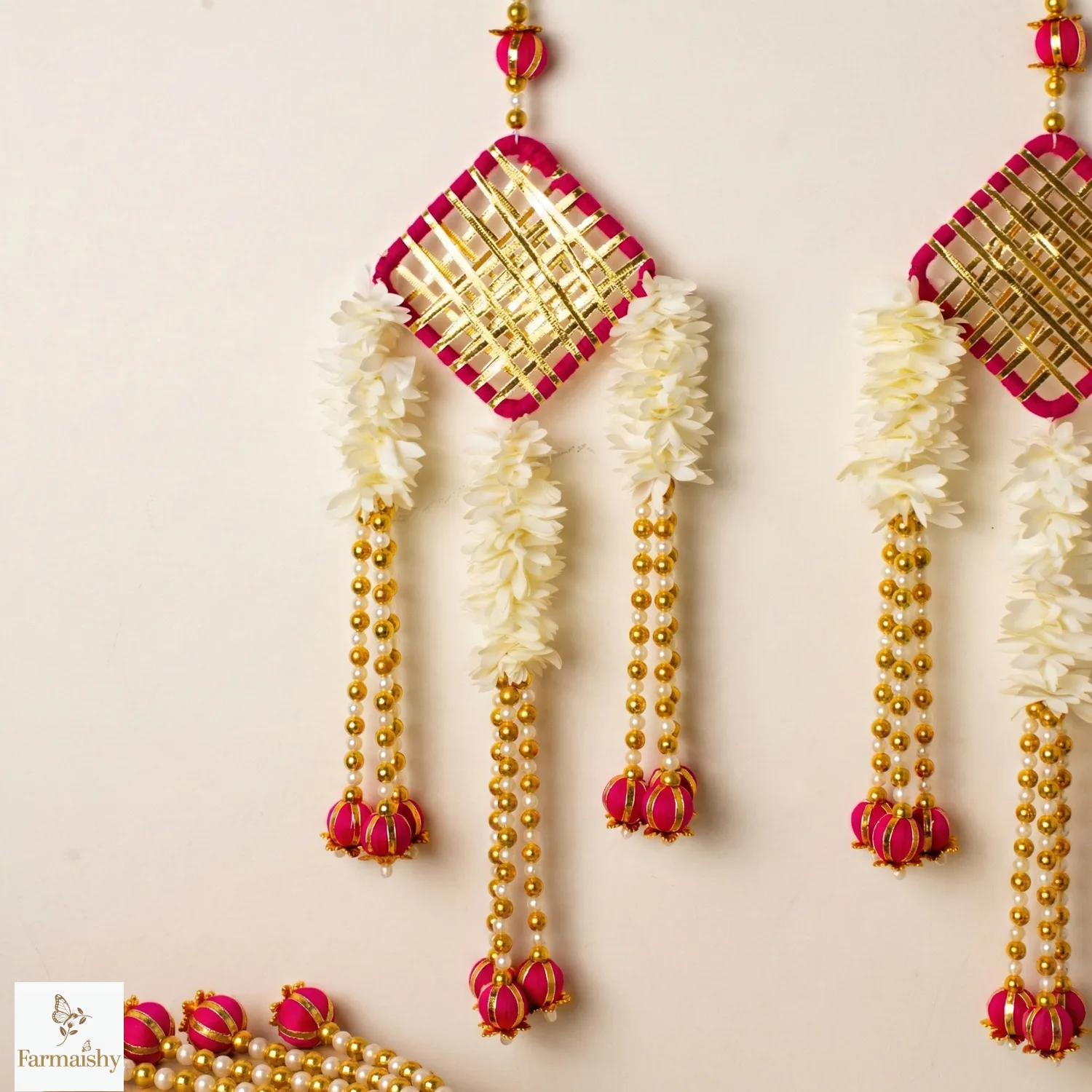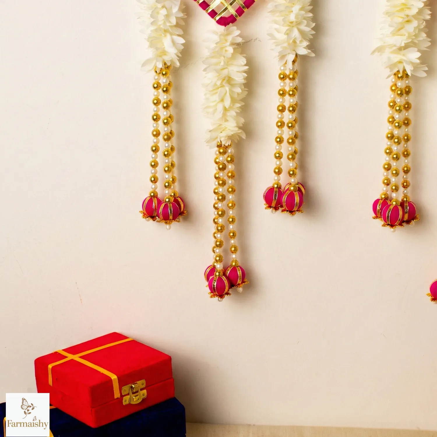 Bring a soft festive glow to your home with this Handmade Door Hanging, designed to add charm, colour, and a touch of tradition to your space. With its delicate floral strands, pink-and-gold accents, and elegant bead detailing, this hanging feels joyful without being over the top.