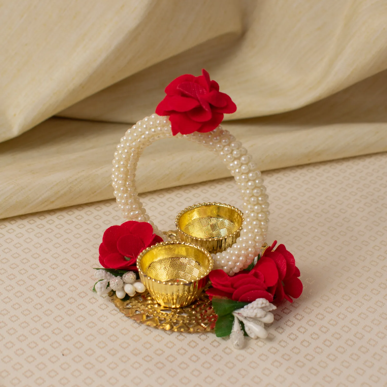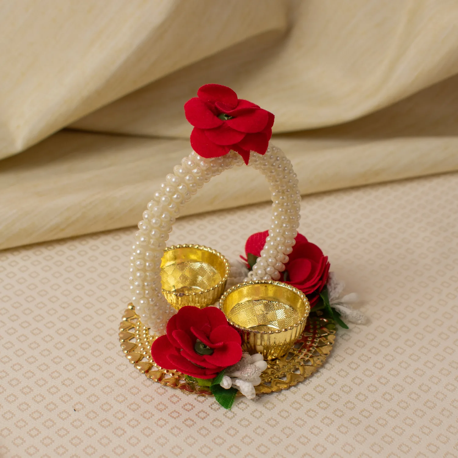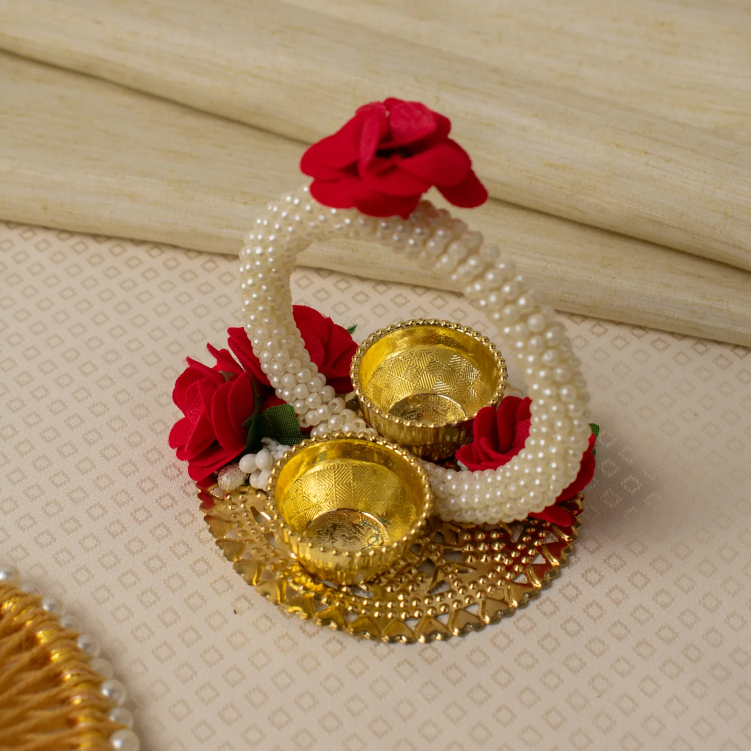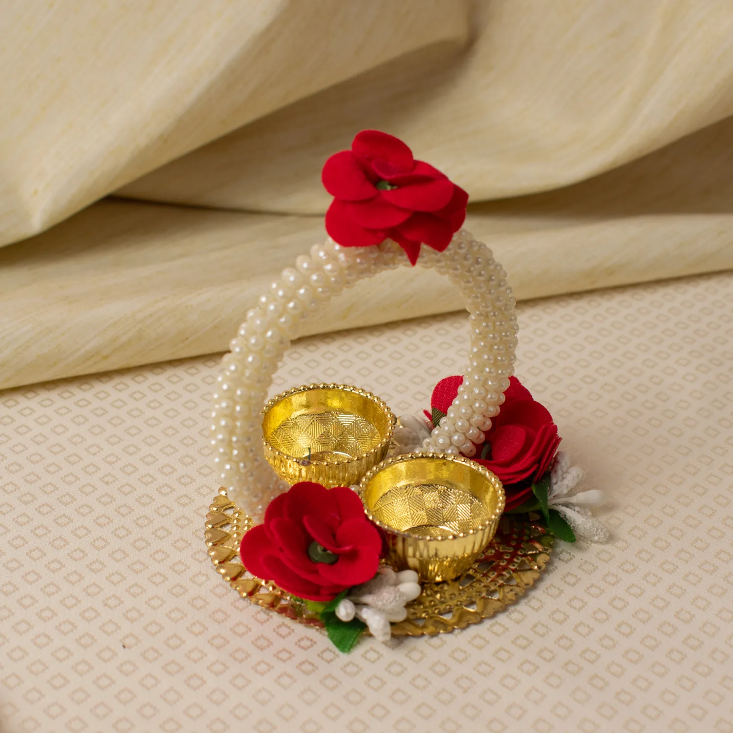Stylish Roli Akshat Pooja Platter with Pearl Handle Bring grace and tradition to your pooja rituals with this Stylish Roli Akshat Pooja Platter, beautifully designed to complement Indian religious ceremonies. Crafted with attention to detail, this decorative platter features an elegant pearl-beaded handle, golden bowls, and vibrant floral embellishments that enhance its festive charm. The platter includes two golden bowls, ideal for holding roli (kumkum) and akshat (rice), making it perfect for daily pooja as well as special religious occasions. Its traditional design and rich color combination add a divine and welcoming touch to any pooja setup or mandir corner. Whether used for Raksha Bandhan, weddings, engagements, housewarming (Griha Pravesh), or festive rituals, this roli akshat pooja platter adds both beauty and cultural significance.