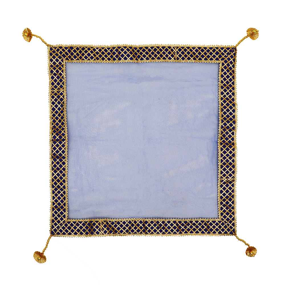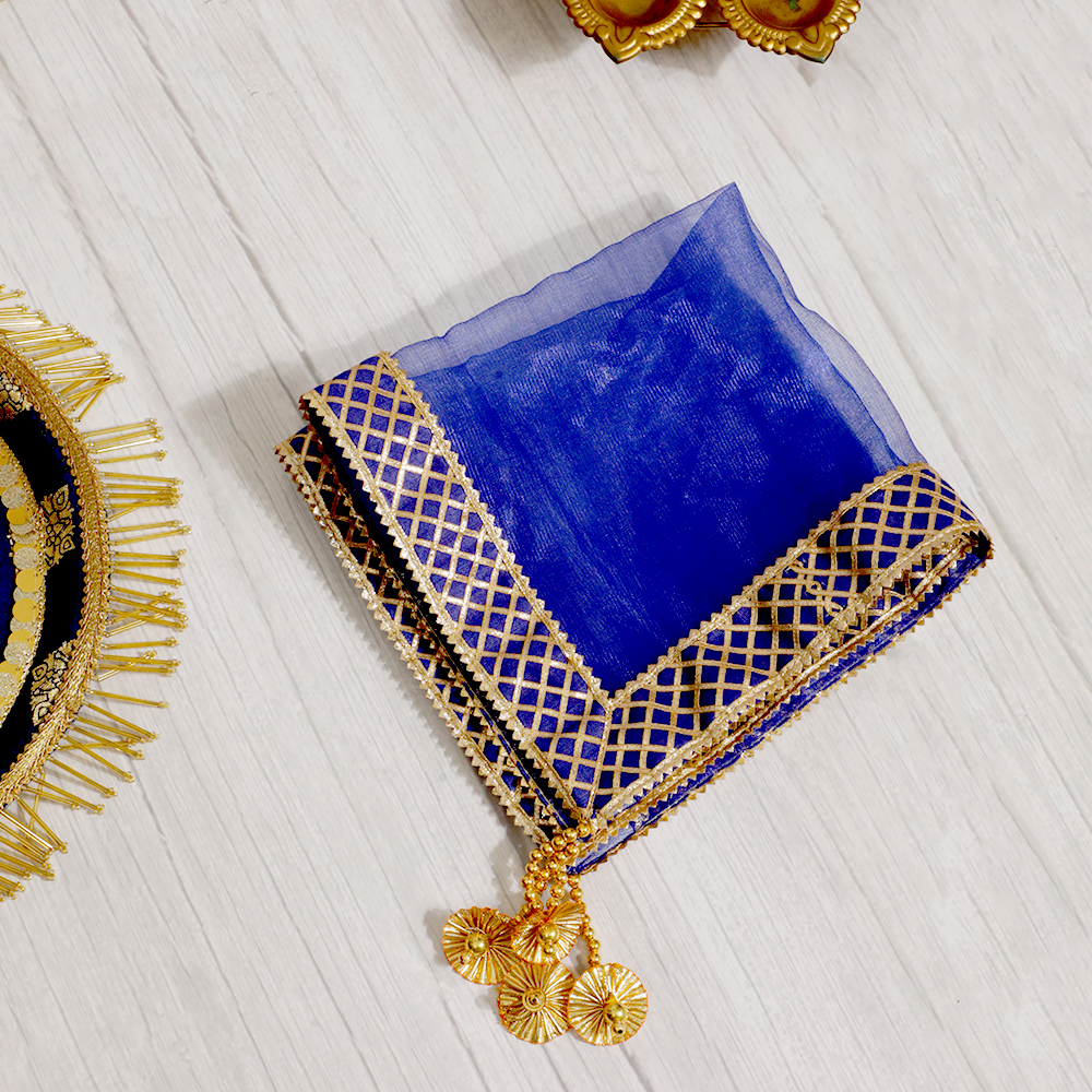 Our Traditional Royal Blue Thali Cover gives your pooja ceremonies a royal refinement. Made from rich velvet-like fabric, this cover represents serenity and devotion with its exquisite golden embroidery against the strong royal blue. Built to precisely match your pooja thali, it safeguards your holy objects while improving the general elegance of your worship area. Suitable for religious events, weddings, and festivals, this thali cover lends every event an ageless elegance.